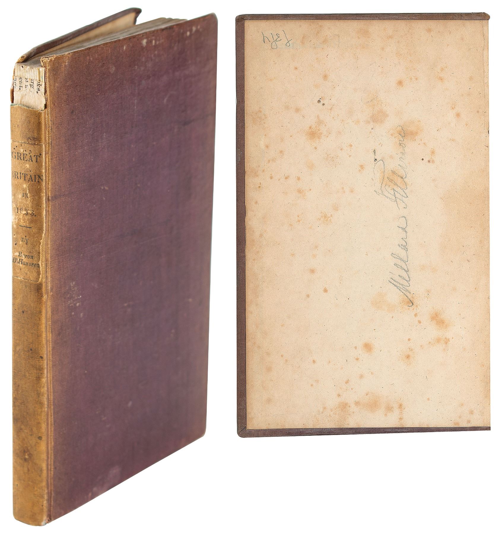 Signed book: Great Britain in 1833 by Baron D'Haussez. First American edition. Philadelphia: E. C. Mielke, 1833. Hardcover, 4.5 x 7.25, 255 pages. Signed on the front pastedown in pencil, "Millard Fillmore." Autographic condition: very good, with light soiling and overall foxing to the signed page. Book condition: VG-/None, with moderate-to-heavy foxing to textblock, loss to the head of the spine, spotting to boards, and a "Library of Lawrence E. Miller" blindstamp to a rear page.