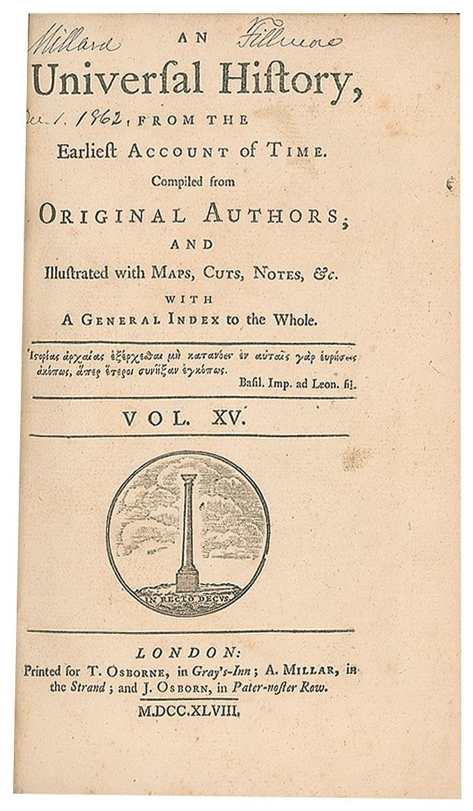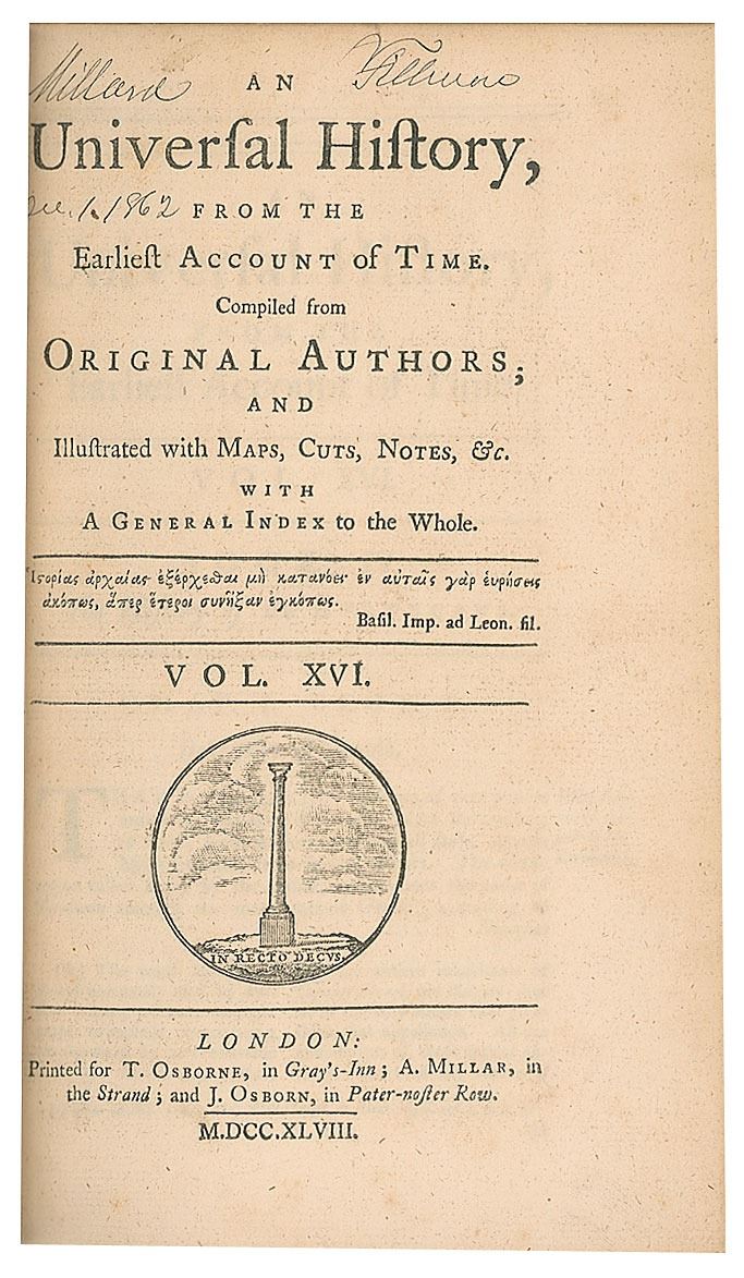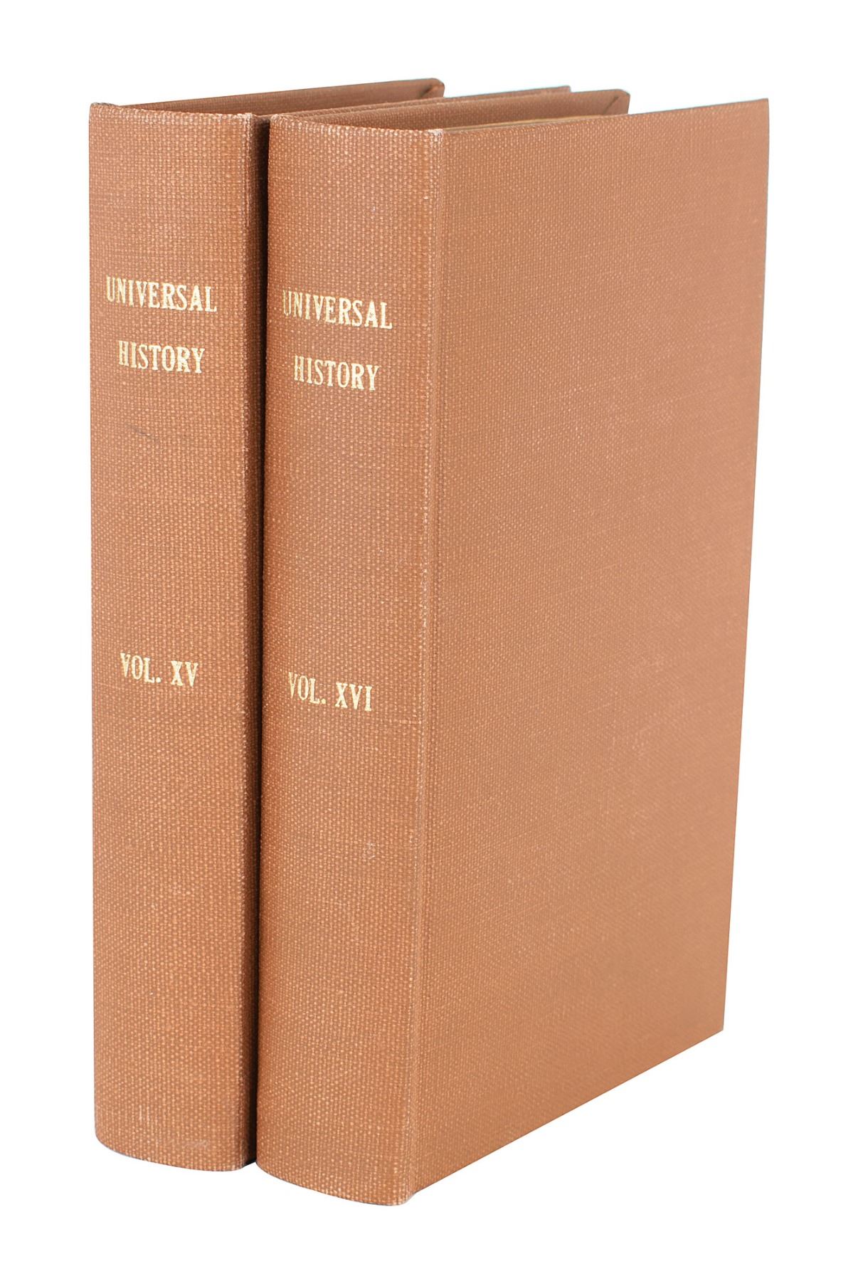 Two signed books from Fillmore's personal library: Universal History, from the Earliest Account of Time, Vols. XV and XVI. Rebound hardcover, 5.5 x 8.5, 592 and 629 pages. Signed on the title page of each volume with his ownership signature in ink, "Millard Fillmore, Dec. 1, 1862." The volumes are complete with impressive fold-out maps and plates. Autographic condition: fine. Book condition: VG+/None.