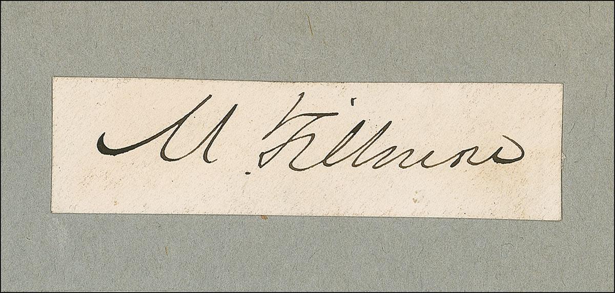 Ink signature, “M. Fillmore,” on an off-white 3 x .75 slip affixed to a slightly larger gray card. In fine condition, with a bit of scattered mild toning. Pre-certified John Reznikoff/PSA/DNA and RRAuction COA.