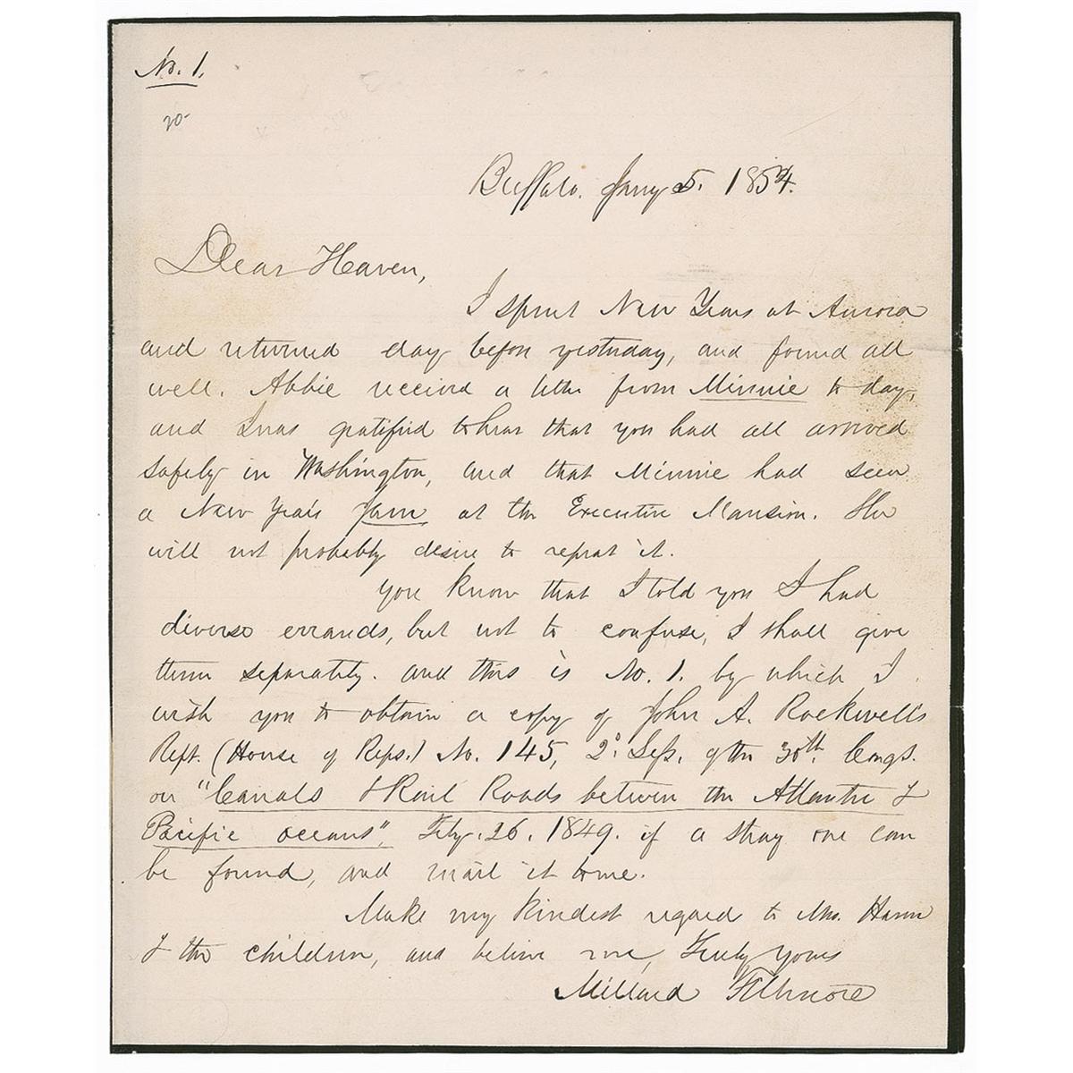 ALS, one page, lightly-lined, 7 x 8.5, black bordered stationery, January 5, 1854. In full: “I spent New Years at Aurora and returned day before yesterday, and found all well. Abbie received a letter from Minnie today, and I was gratified to hear that you had all arrived safely in Washington, and that Minnie had seen a New Year's jam at the Executive Mansion. She will not probably desire to repeat it. You know that I told you I had diverse errrands, but not to confuse, I shall give them separately. And this is No. 1 by which I wish you to obtain a copy of John A. Rockwell's Rept. (House of Reps) No. 145, 2 Spe. of the 30th Congs. on ‘Canals & Rail Roads between the Atlantic & Pacific oceans,’ Febry 26, 1849, if a stray one can be found, and mail it home. Make kindest regards to Mrs. Ham & the children.” In fine condition, with some scattered light toning and wrinkling. Written on mourning stationery months after losing his wife Abigail - "Abbie" was his daughter, Mary Abigail Fillmore, who dies suddenly only months after this letter was written.