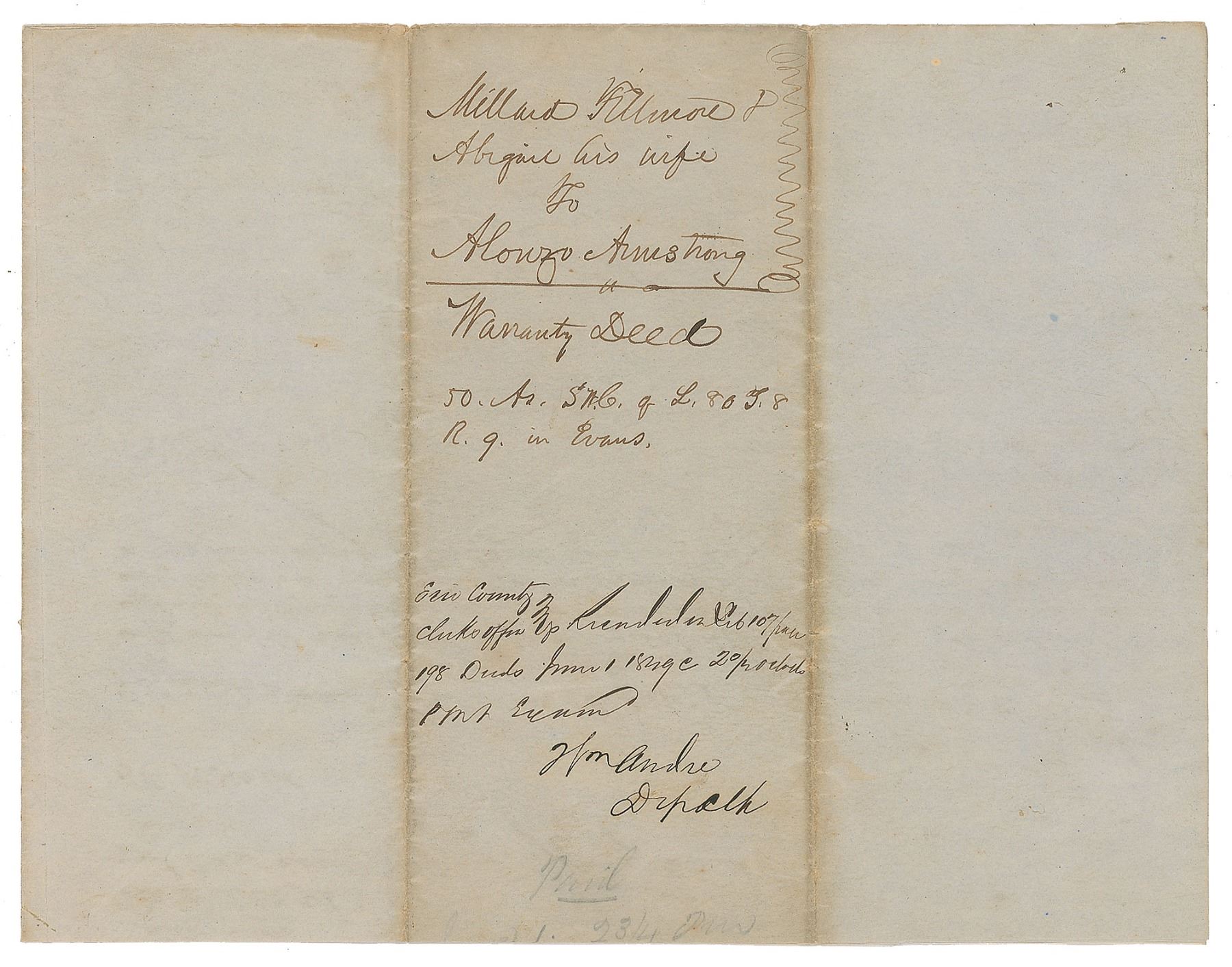 Partly-printed DS, signed four times, "Millard Fillmore," and once, "Abigail Fillmore," one page, 10 x 15.5, May 31, 1849. Land indenture filled out by Millard Fillmore, incorporating his name three times. In part: "This indenture…Between Millard Fillmore and Abigail his wife of Buffalo…and Alonzo Armstrong…in consideration of the Sum of Three hundred and ninety seven 33/100 dollars…have granted, bargained, sold…that certain piece of Land situate in the town of Evans in the said county and state, known and distinguished by being the south west part of Lot number Eighty…the said Millard Fillmore for himself, his heirs, executors, and administrators does covenant, grant, bargain and agree, that at the time of the ensealing and delivery of these presents, he is well seized of the premises above conveyed." Also docketed on the reverse by Millard Fillmore: "Millard Fillmore & Abigail his wife to Alonzo Armstrong, Warranty Deed." In very good to fine condition, with separation along most of the central horizontal fold. Given the rarity of Abigail Fillmore's signature and the abundance of Millard Fillmore's writing on this document, this is a particularly desirable piece.