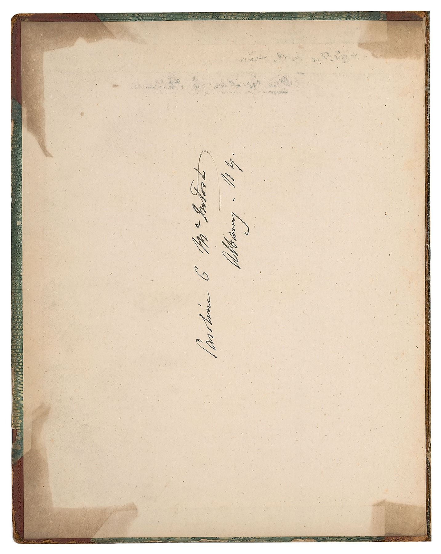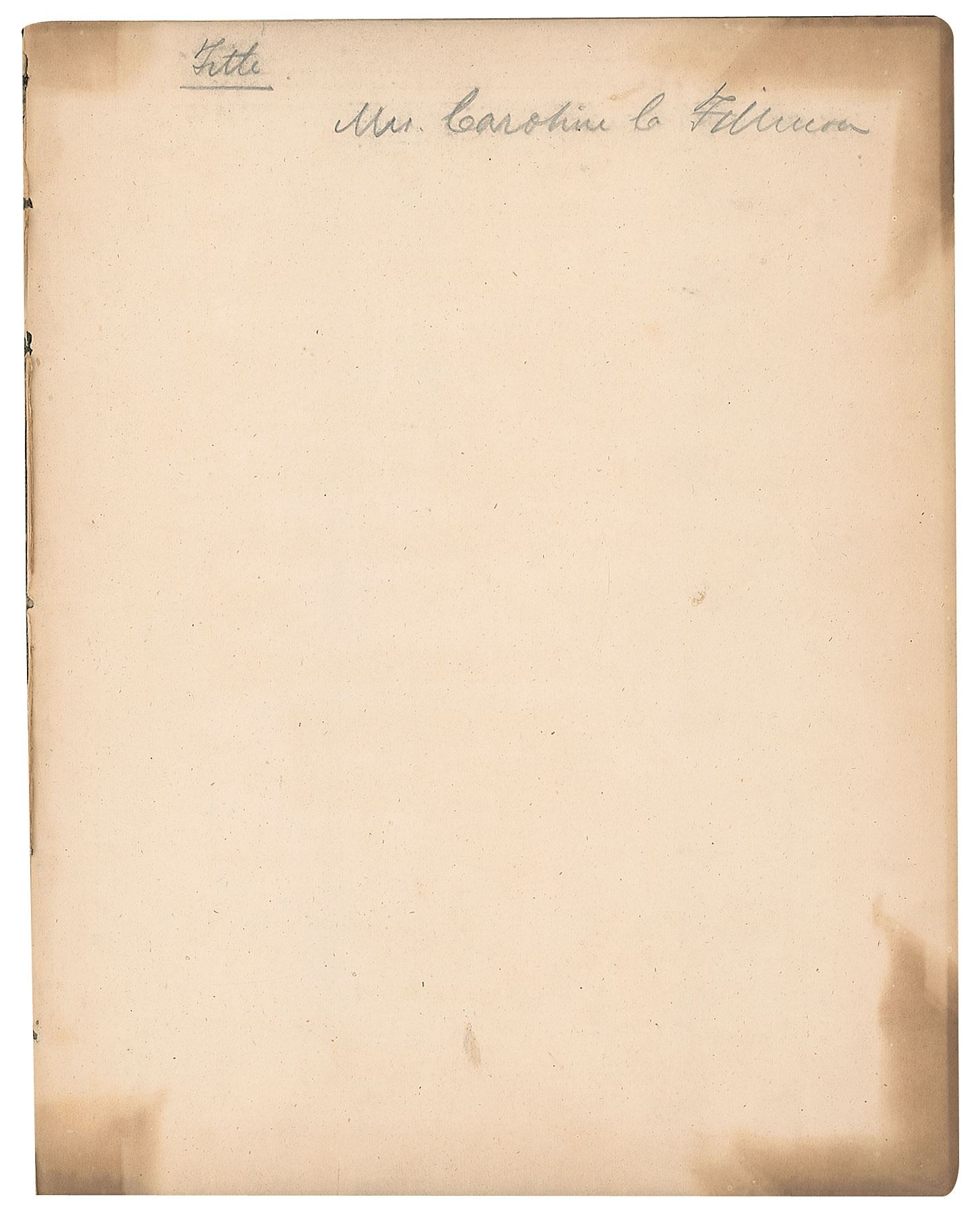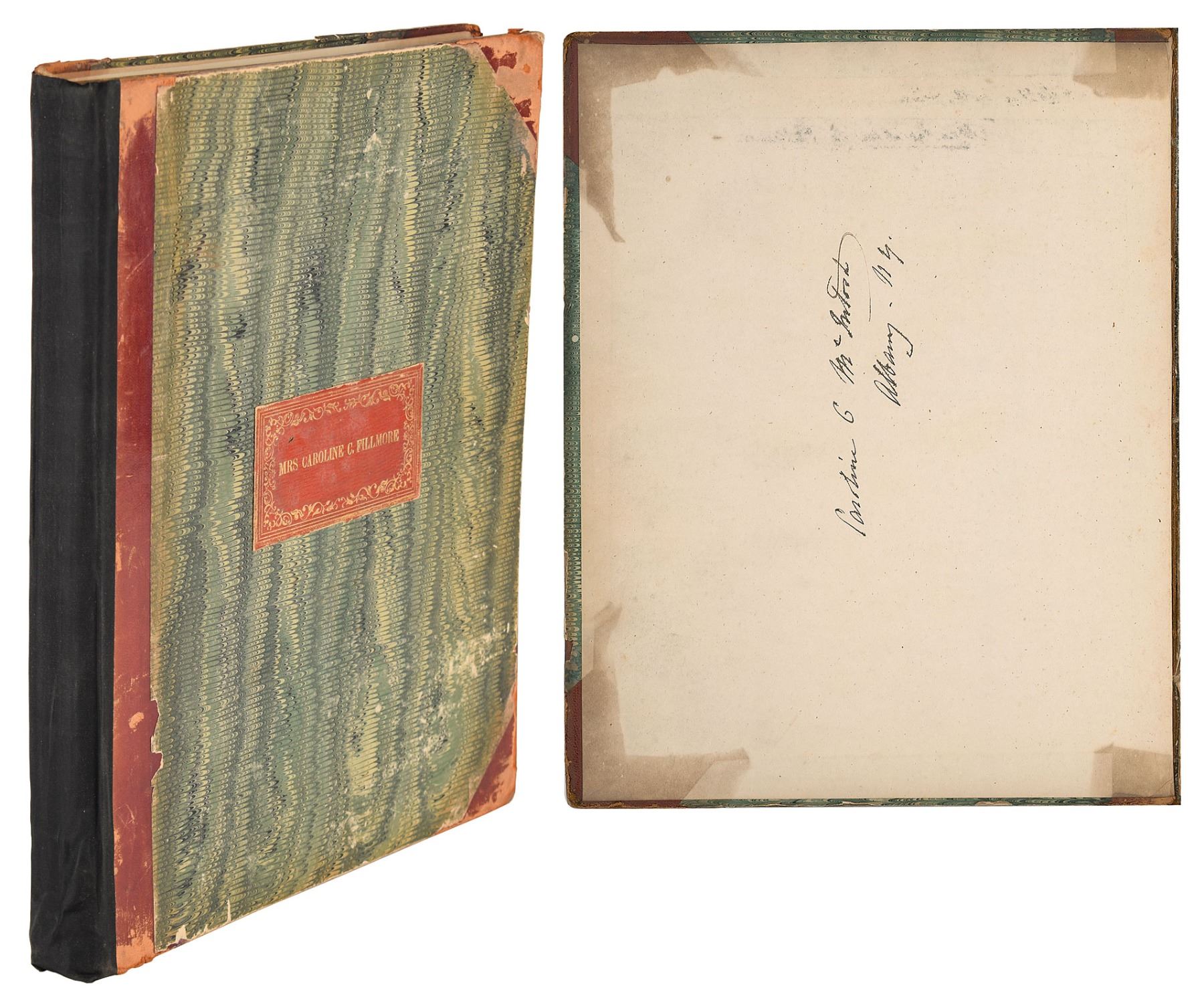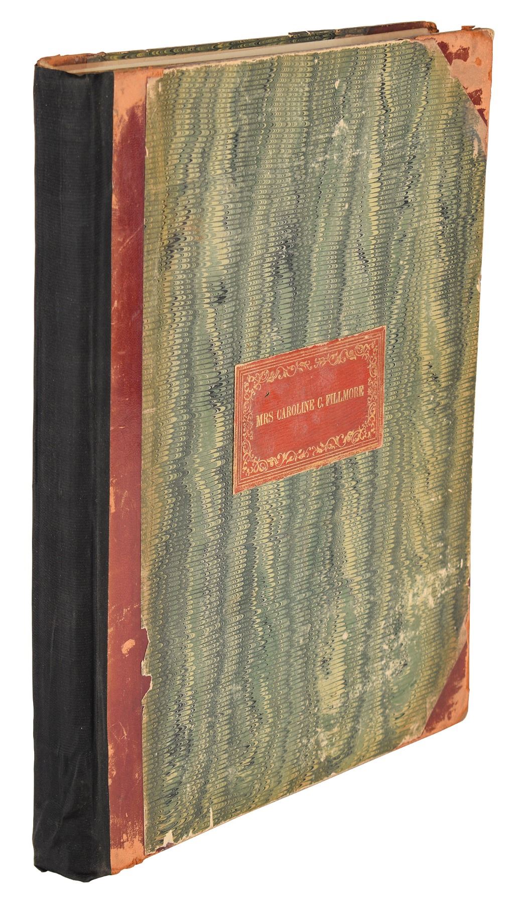 Custom-bound book of sheet music, signed twice by Millard Fillmore in his wife's name ("Mrs. Caroline C. Fillmore"), and signed six times by his wife using her maiden name (with variations including "Caroline C. McIntosh" and "C. C. McIntosh"). Hardcover, 10.5 x 13, with quarter red leather spine and spandrels, and an inlaid red leather name panel at center gilt embossed "Mrs. Caroline C. Fillmore." Also featuring light green feather patterned paper covers. Missing spine and loosened front and back covers reinforced with binding tape. Expected wear to binding, edges, and corners. Scattered foxing, ghost printing impressions, and isolated closed tears, else very good.