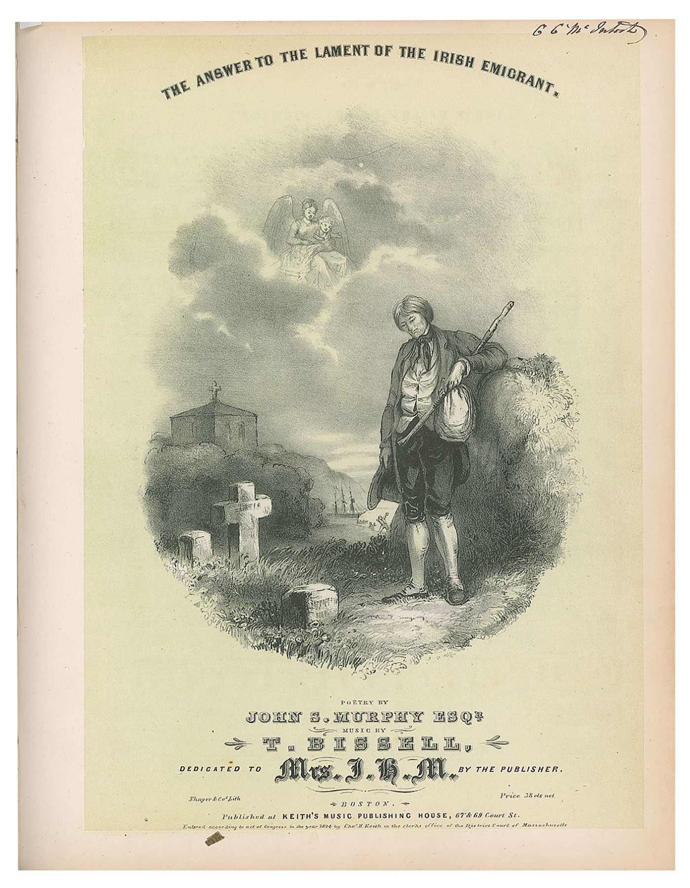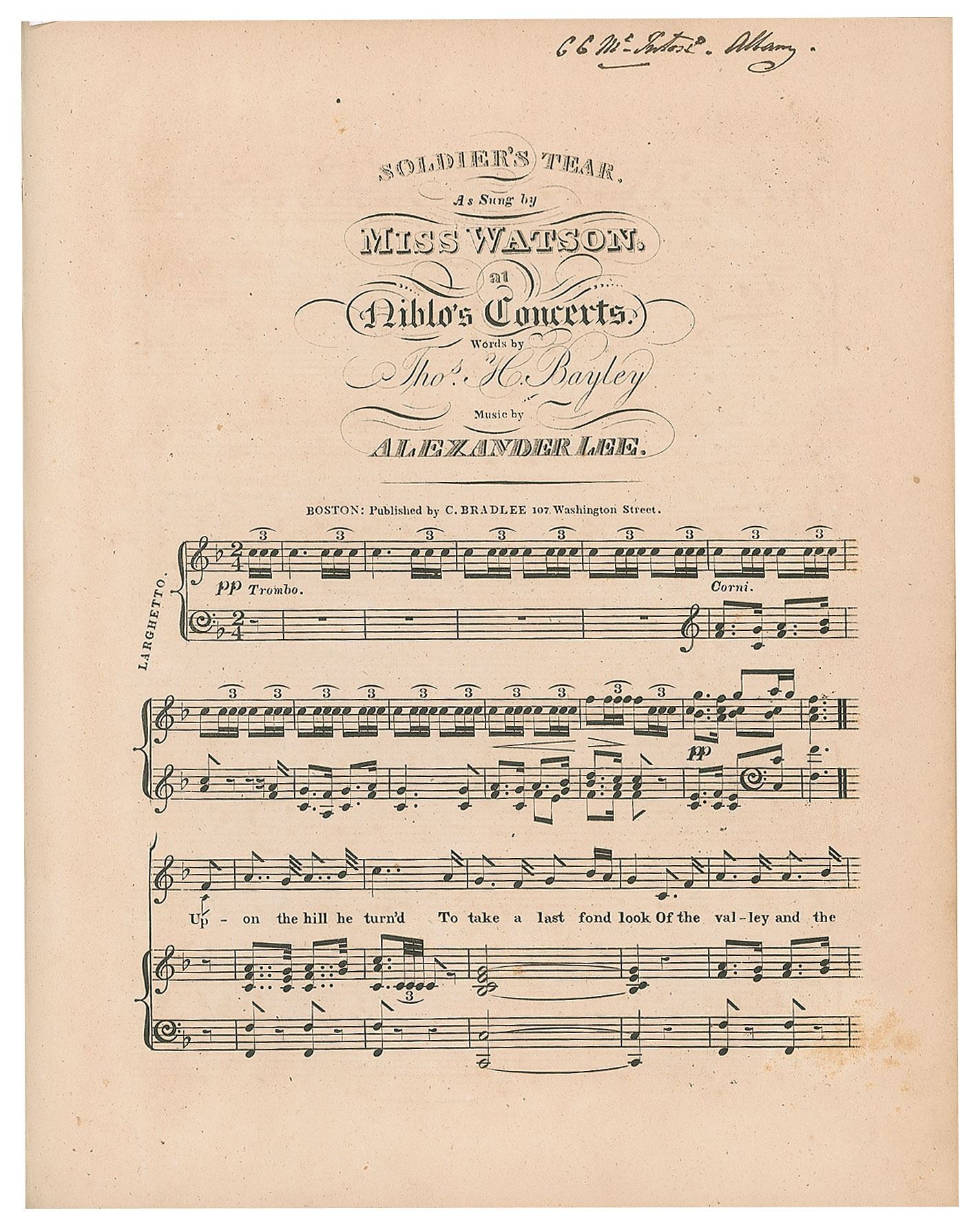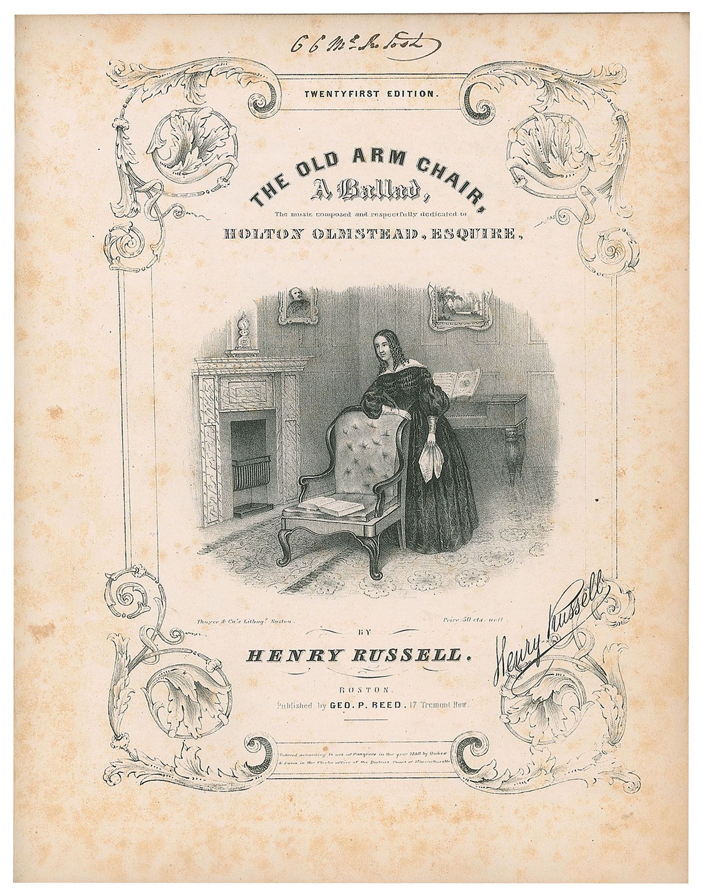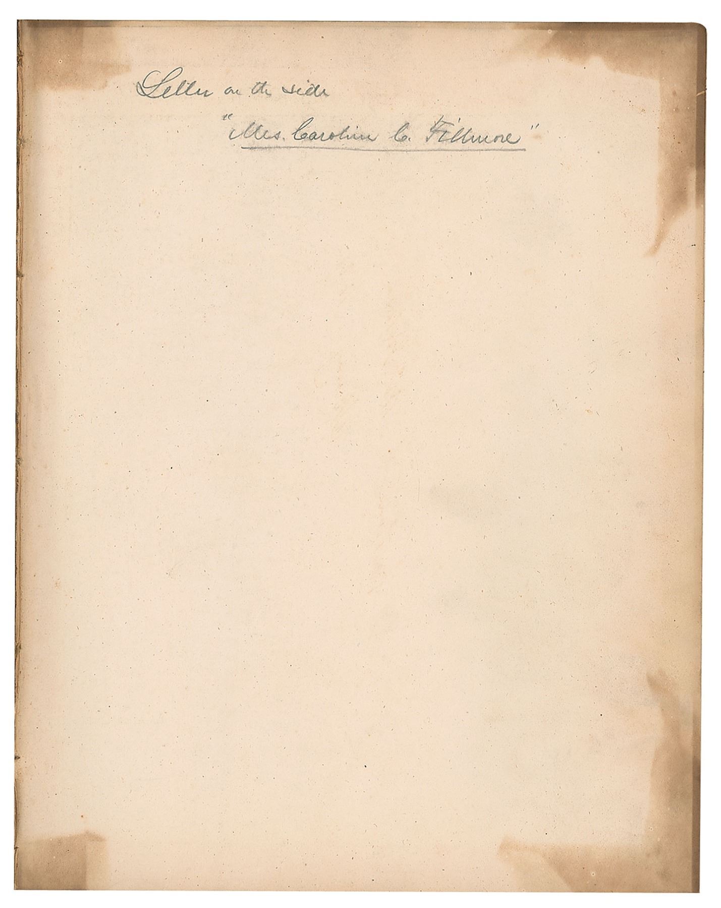 Custom-bound book of sheet music, signed twice by Millard Fillmore in his wife's name ("Mrs. Caroline C. Fillmore"), and signed six times by his wife using her maiden name (with variations including "Caroline C. McIntosh" and "C. C. McIntosh"). Hardcover, 10.5 x 13, with quarter red leather spine and spandrels, and an inlaid red leather name panel at center gilt embossed "Mrs. Caroline C. Fillmore." Also featuring light green feather patterned paper covers. Missing spine and loosened front and back covers reinforced with binding tape. Expected wear to binding, edges, and corners. Scattered foxing, ghost printing impressions, and isolated closed tears, else very good.