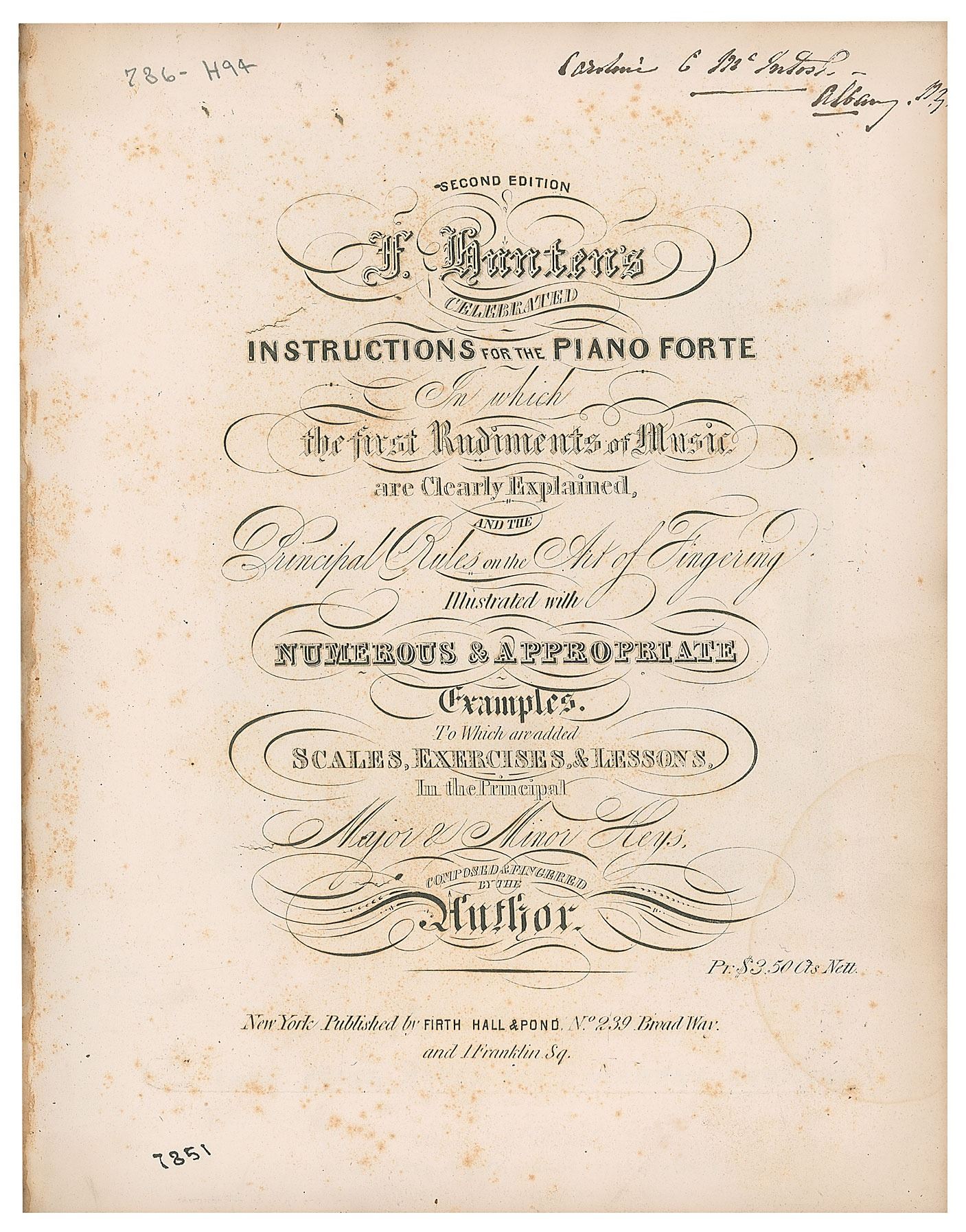 The book contains: Franz Hünten's Celebrated Instructions for the Piano Forte in which the First Rudiments of Music are Clearly Explained, and the Principal Rules in the Art of Fingering (New York: Firth, Hall & Pond) unknown, but ca. 1854. It has been bound with over 40 pieces of piano sheet music arranged after Beethoven, Mozart, Strauss, and others. Caroline Fillmore's abundant finger markings throughout indicate that she dutifully played the waltzes, airs, ballads, and quick steps contained within the custom bound book. Millard Fillmore married his second wife, Caroline C. Fillmore, on February 10, 1858, five years after leaving the presidency.