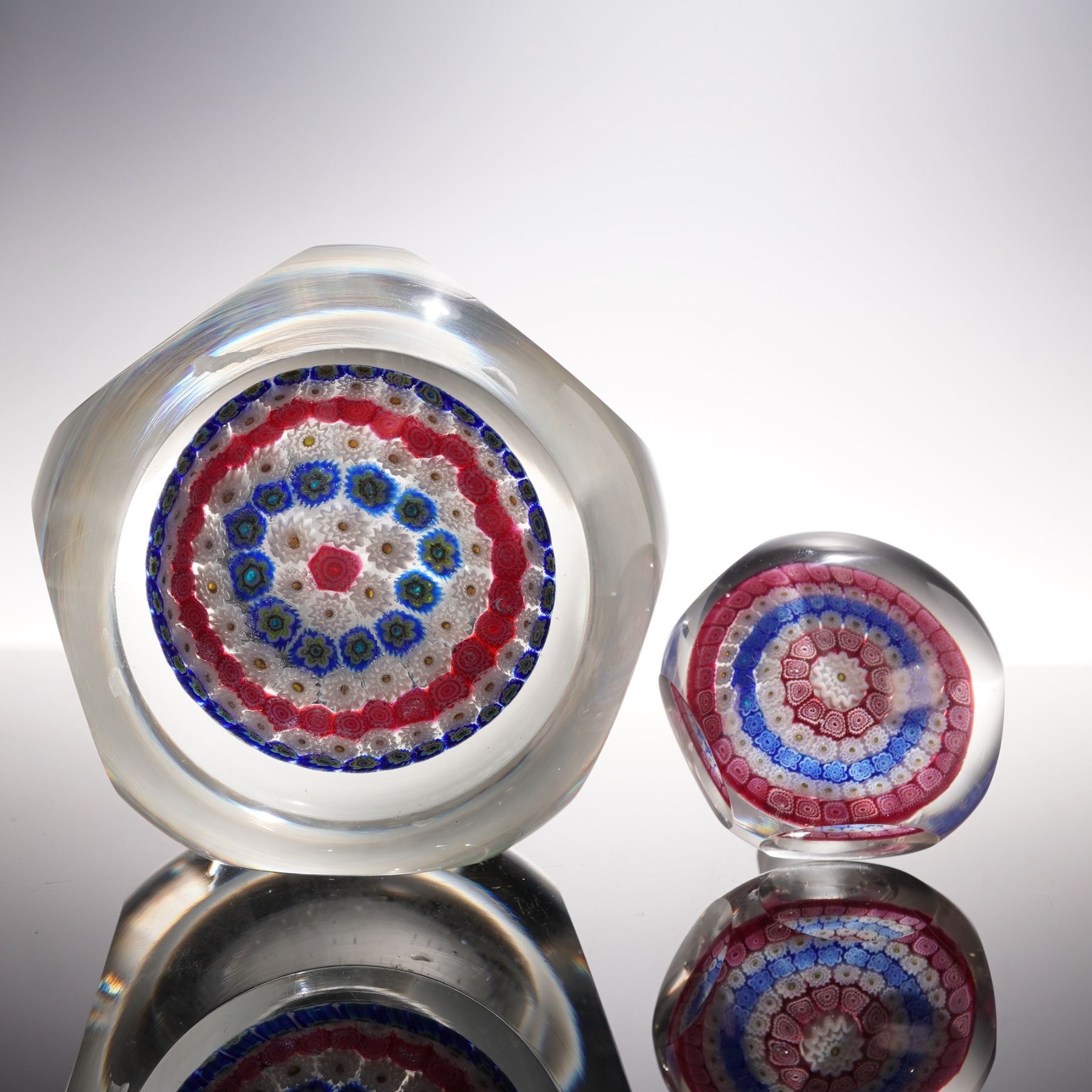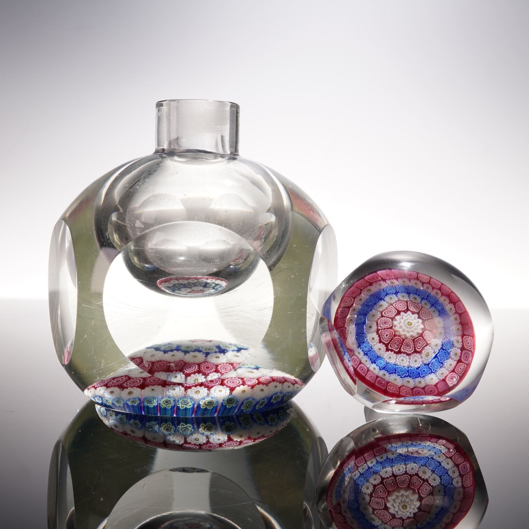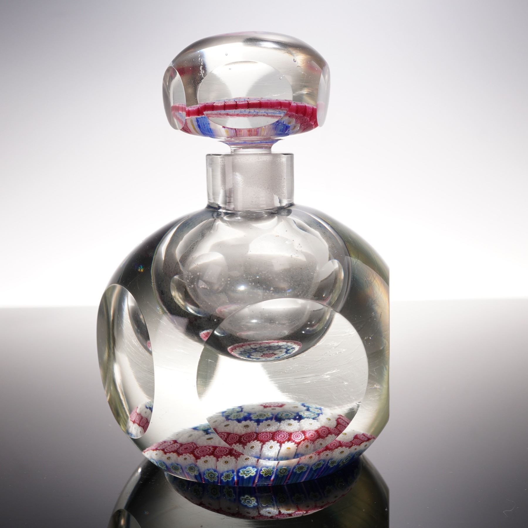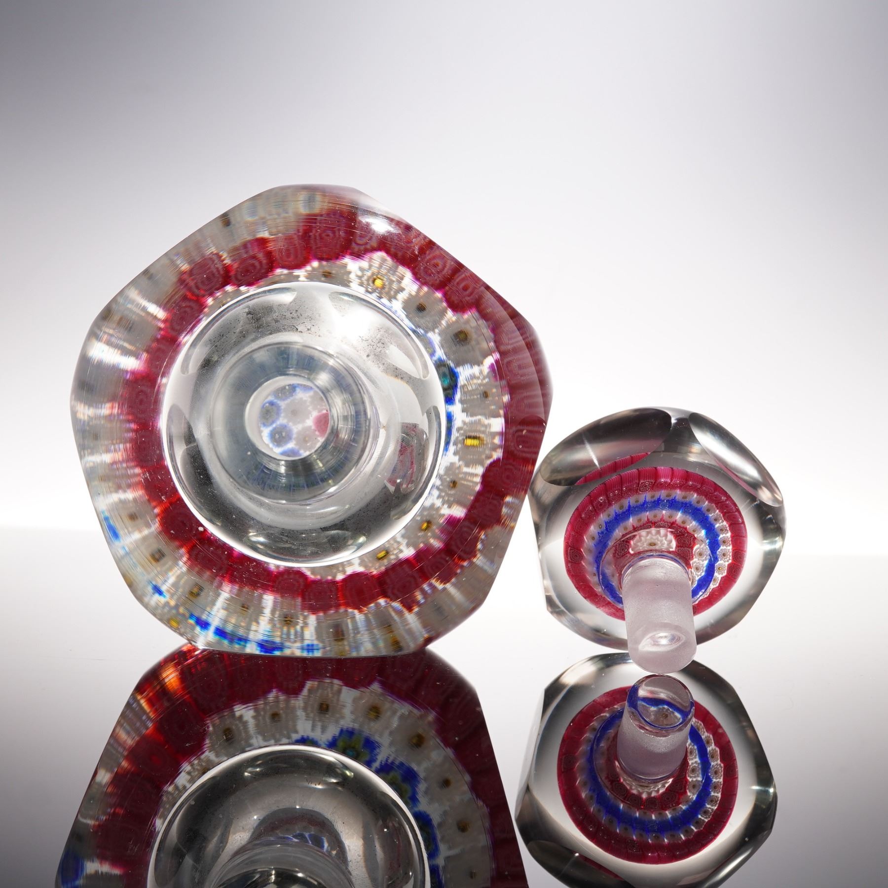 A striking modern millefiori glass scent bottle, the circular body enclosing a vibrant concentric design of colorful canes in red, white, blue, and yellow, arranged in symmetrical geometric rings reminiscent of classic paperweights. The bottle's substantial faceted form enhances the optical depth of the millefiori base, while the matching faceted stopper continues the pattern, aligning perfectly when in place. This elegant piece demonstrates both precision and artistry, evoking the tradition of mid-century Murano craftsmanship.