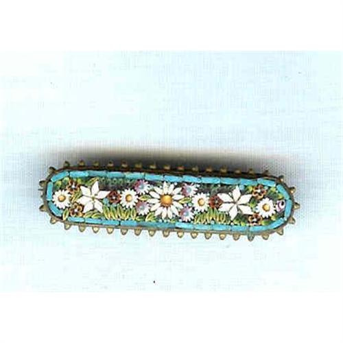 Made when this micromosaic art was minescule and subtle this little bar pin has etruscan influenced blobs of metal all around the edge. Very dainty