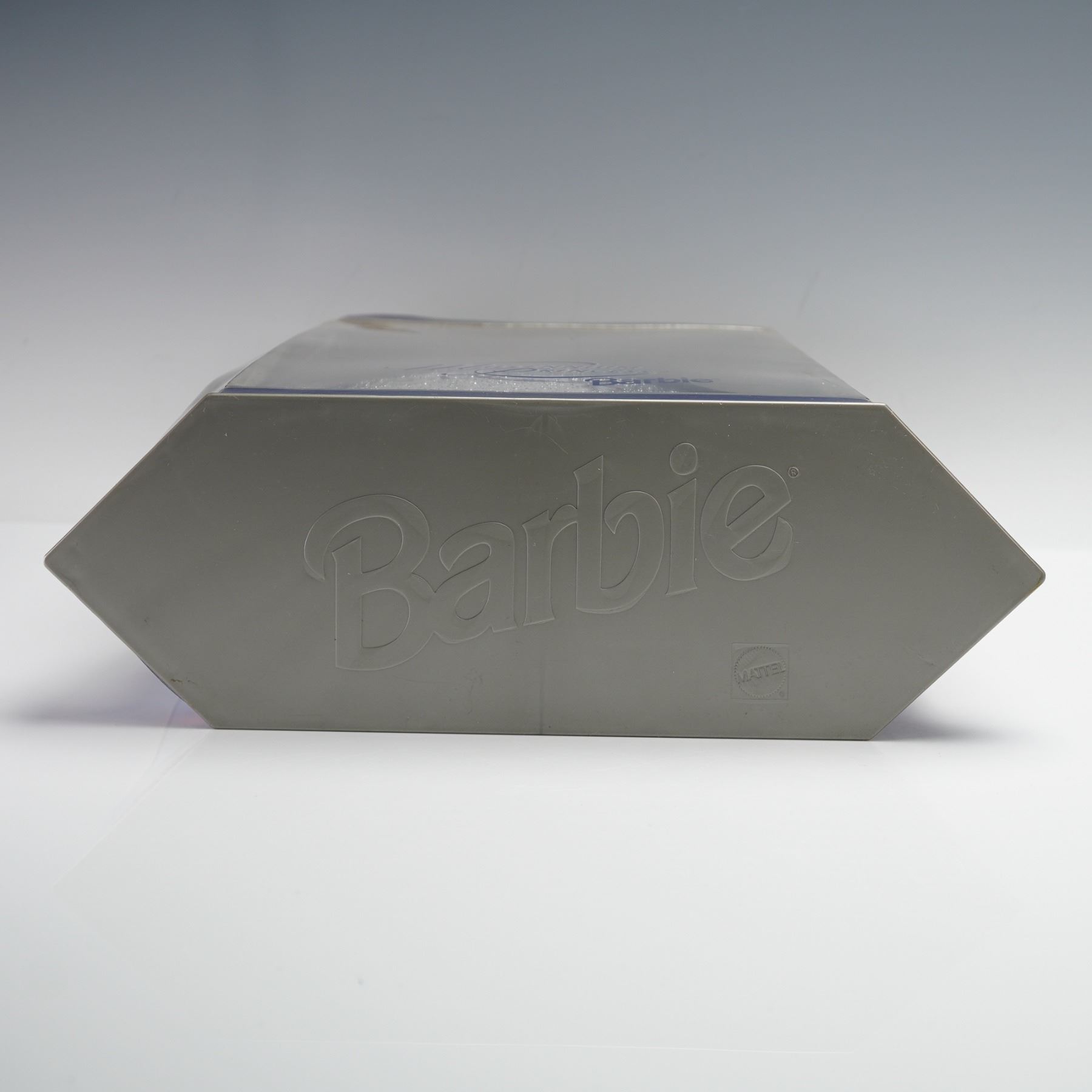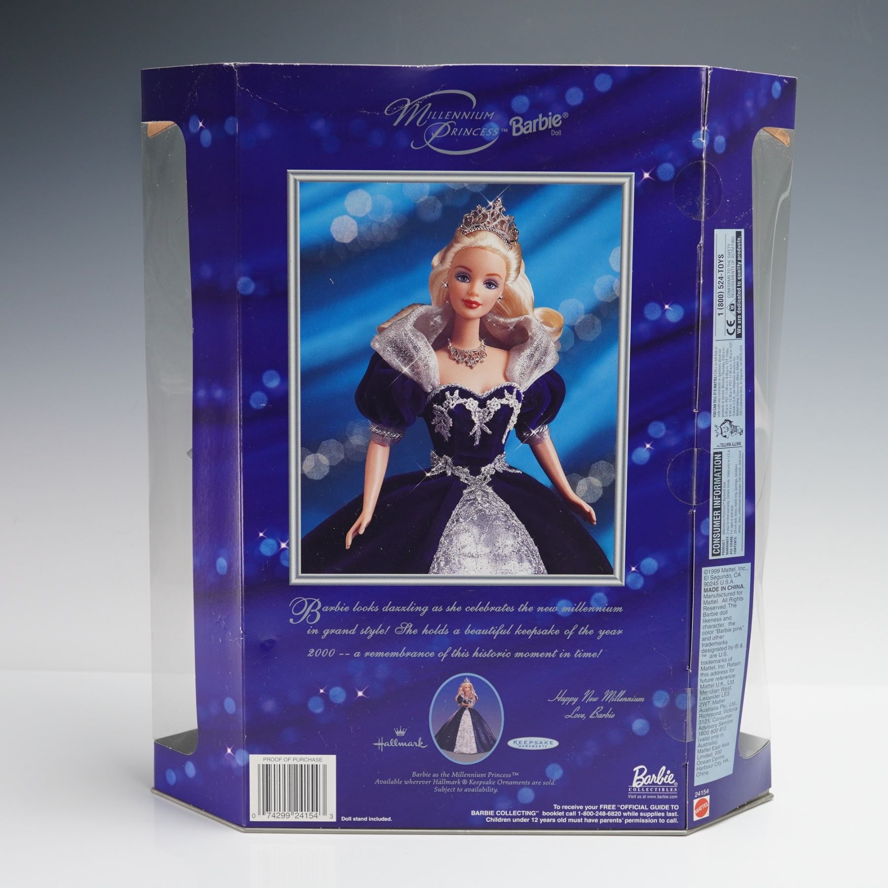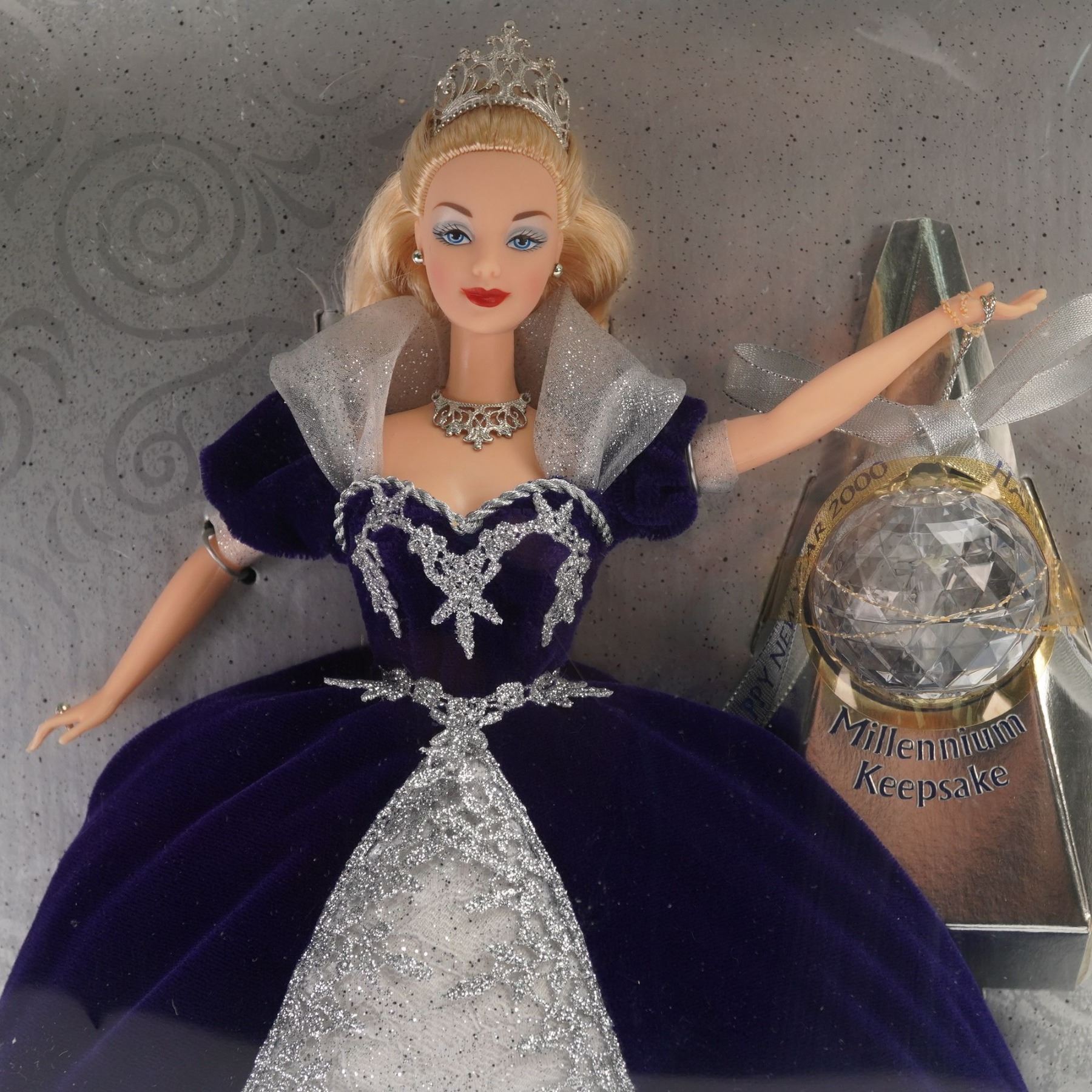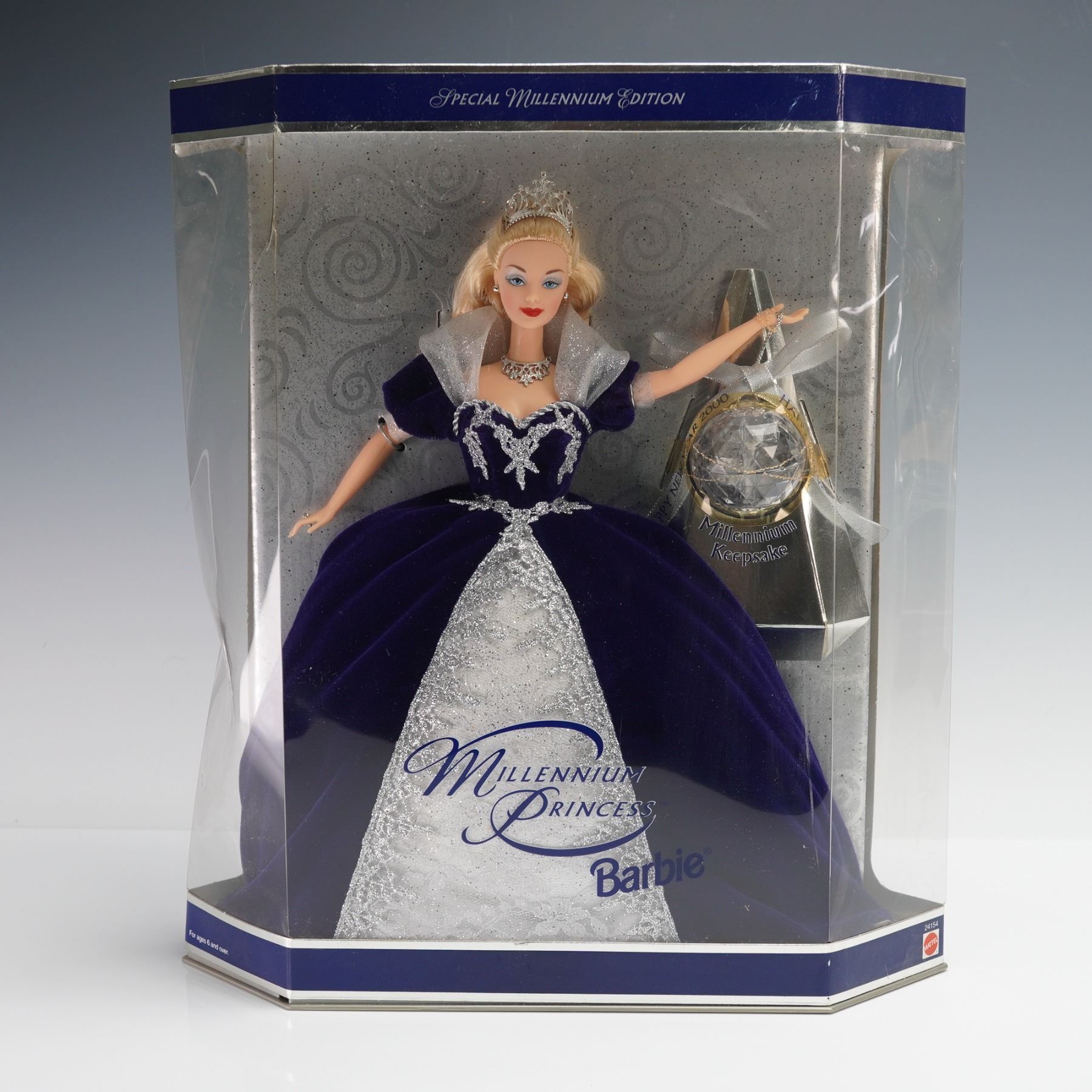 This 1999 Mattel Millennium Princess Barbie doll (UPC 074299241543) is a special edition released to commemorate the turn of the millennium. The doll is dressed in an elegant midnight blue velvet gown with silver lace accents and a shimmering silver organza collar. Accessories include a sparkling tiara, earrings, necklace, ring, and shoes. A faux-crystal ornament marked Happy New Year 2000 is also included. The doll features blonde hair styled in soft waves and comes in the original packaging with a swirl background design.
