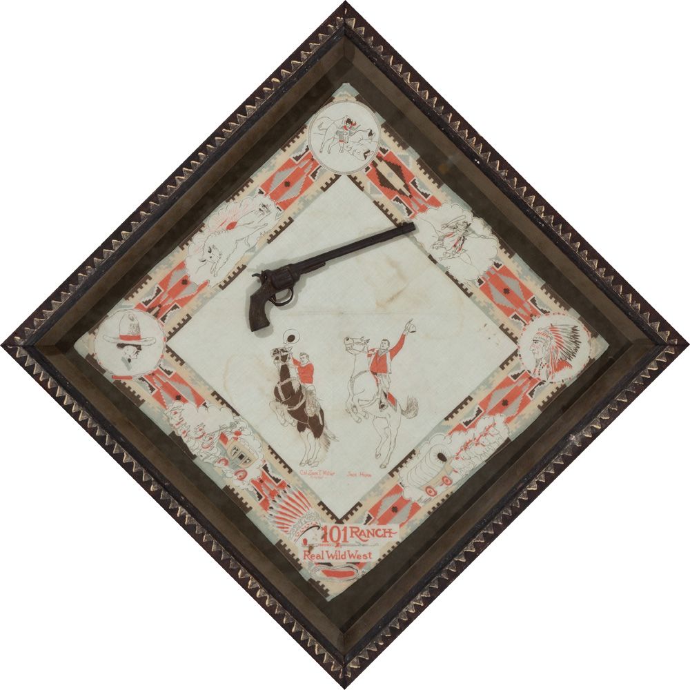 b) Framed (shadow box style) “101 Ranch – Real Wild West” scarf with Col. Zack Miller and Jack Hoxie, with antique cast iron “101 Ranch” cap gun. Framed 29” x 29” x 3”;