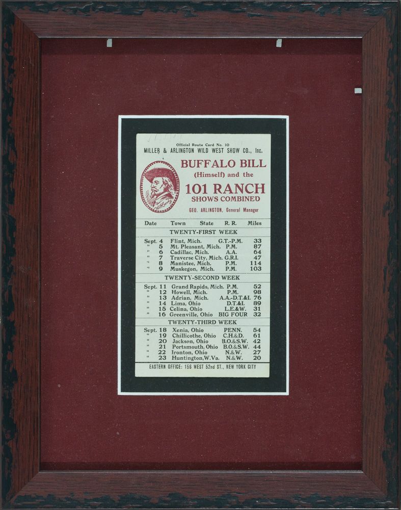 c) Buffalo Bill (Himself) and 101 Ranch Shows Combined. Official Route Card No. 10, 6” x 3 1/2” and framed to 12 1/2” x 10”.