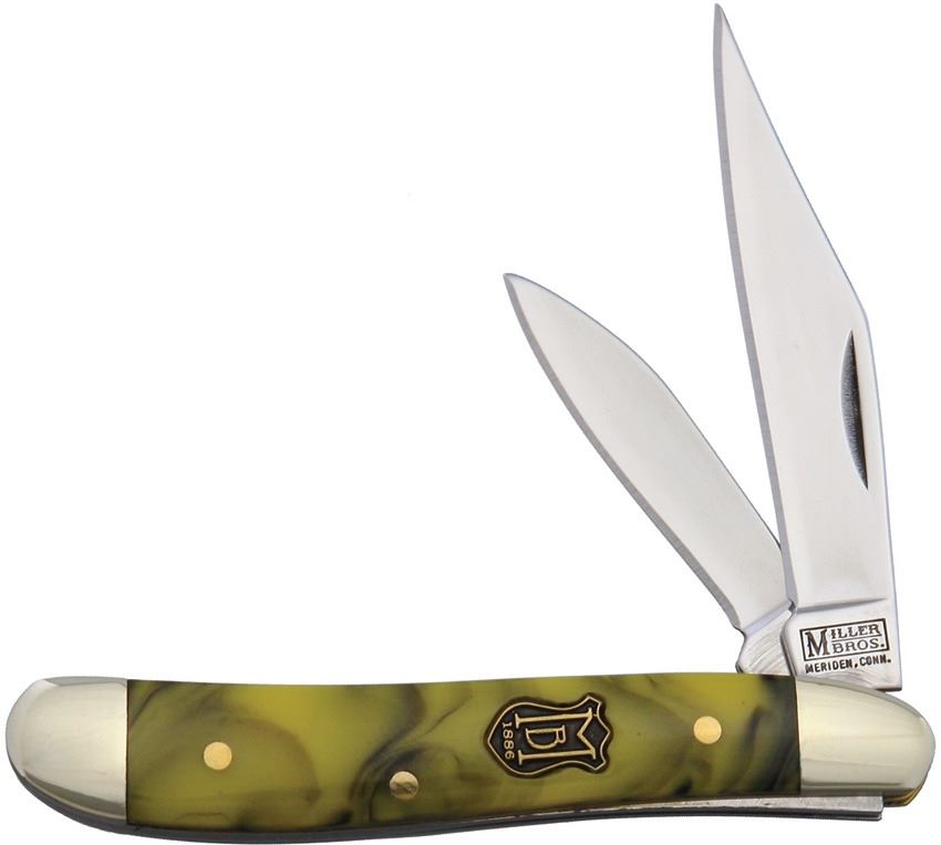 2 7/8" closed. Stainless clip and pen blades. Funky Monkey (yellow and black) composition handles with nickel silver bolsters and MB inlay shield.