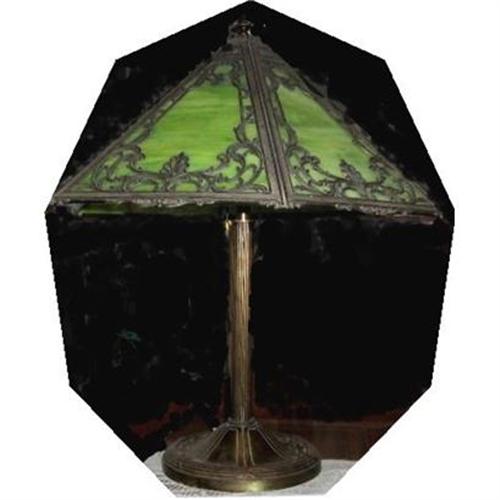 Miller #1853 table lamp with six pyramid cut slag glass panels in detailed cast metal filigree overlay shade on brass metal base. Lamp base and post has age related patina<p>Nicely varigated green and ivory marble pattern slag glass panels with no cracks or chips. The metal filigree on the shade appears to have lost original brass finish.<p>The original two pull strings and electrical cord are fully functional. However, the cord, although not original, is older and technically should be replaced to meet current code standards. Dual bulb socket cluster in great working order, one original, one a replacement.<p>Measures 24 inches high with a 7.75 inch diameter base. Six paneled shade has a 13 inch drop with an 18.25 inch spread.<p>We recommend that at time of packaging it be acceptable for us to remove the glass panels and wrap separately for a safer transit. Lower support clips are missing as pictured. Raised MILLER trademark and Number 1853 on under-base. Trademark used circa 1904 - 1910.<p>Please note: The pictures reflect a yellow cast when lamp is lit, however, this is more from the flash. It is much more of a subdued green.