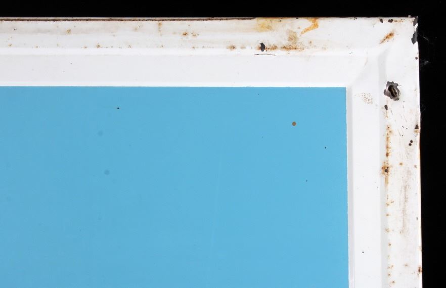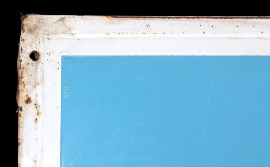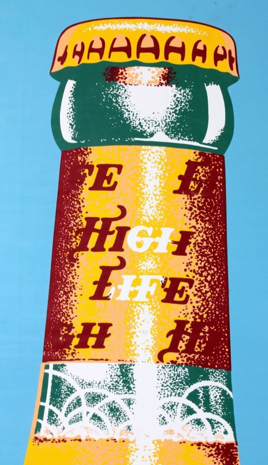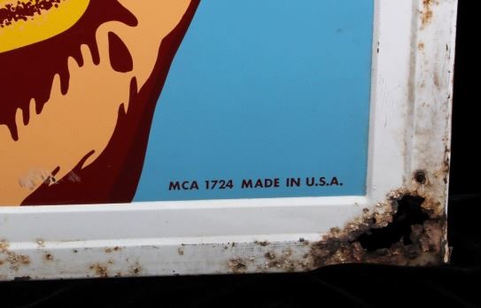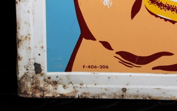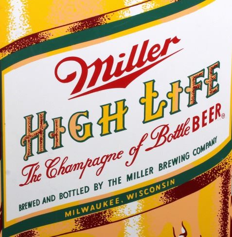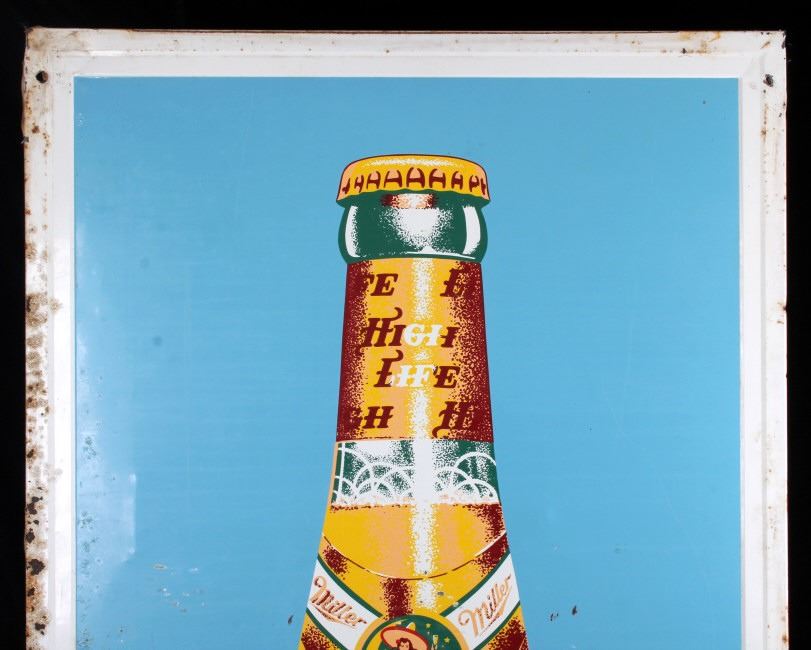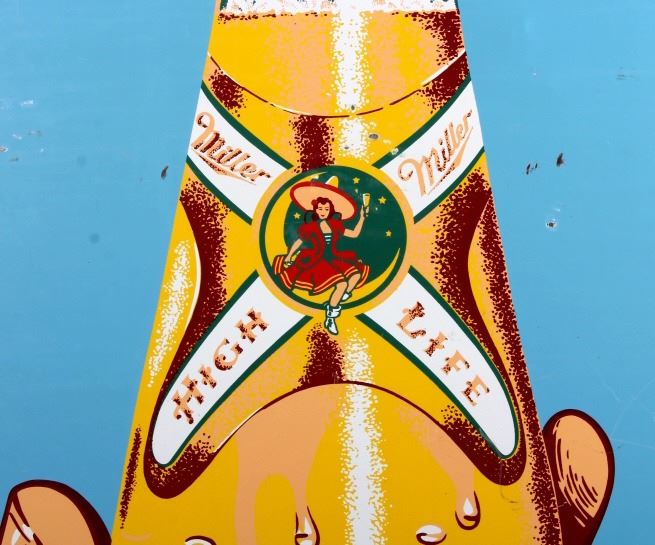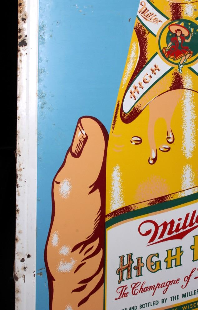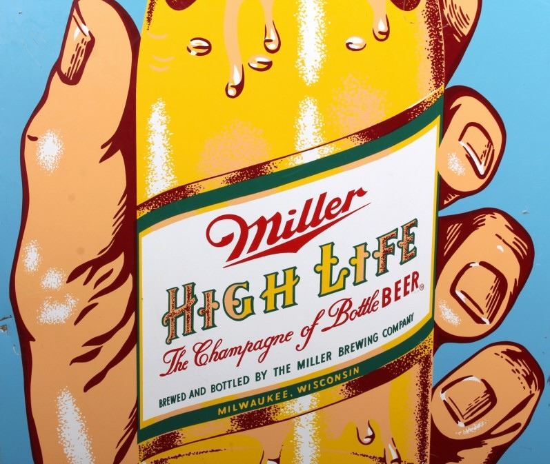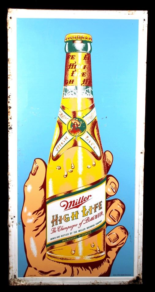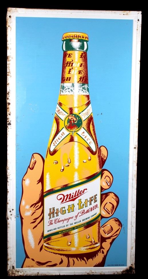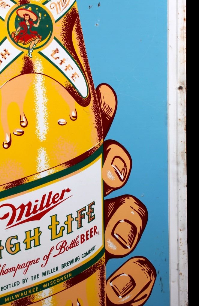 This is a Miller High Life advertising sign rare sign from circa 1938. The sign shows a large hand holding the High Life bottle. The neck of the bottle has the High Life girl sitting in the crescent moon. The sign is marked "F-406-206" in the lower left corner and "MCA 1724 Made in U.S.A." in the lower right corner. The Miller High Life sign is in good overall condition. There is some rust and paint loss around the edges, but the field shows minimal wear. The sign measures 34" wide and 69.5" tall.