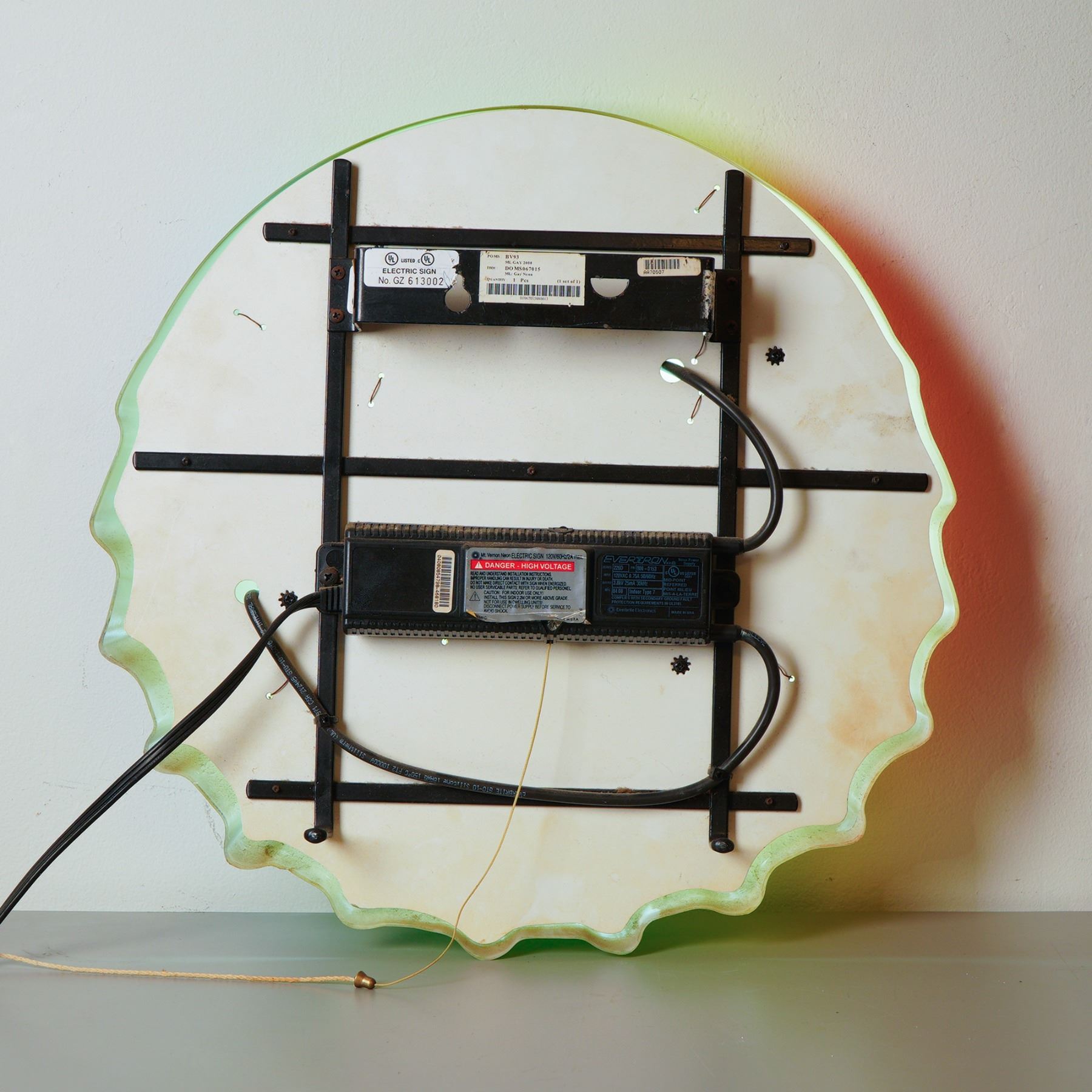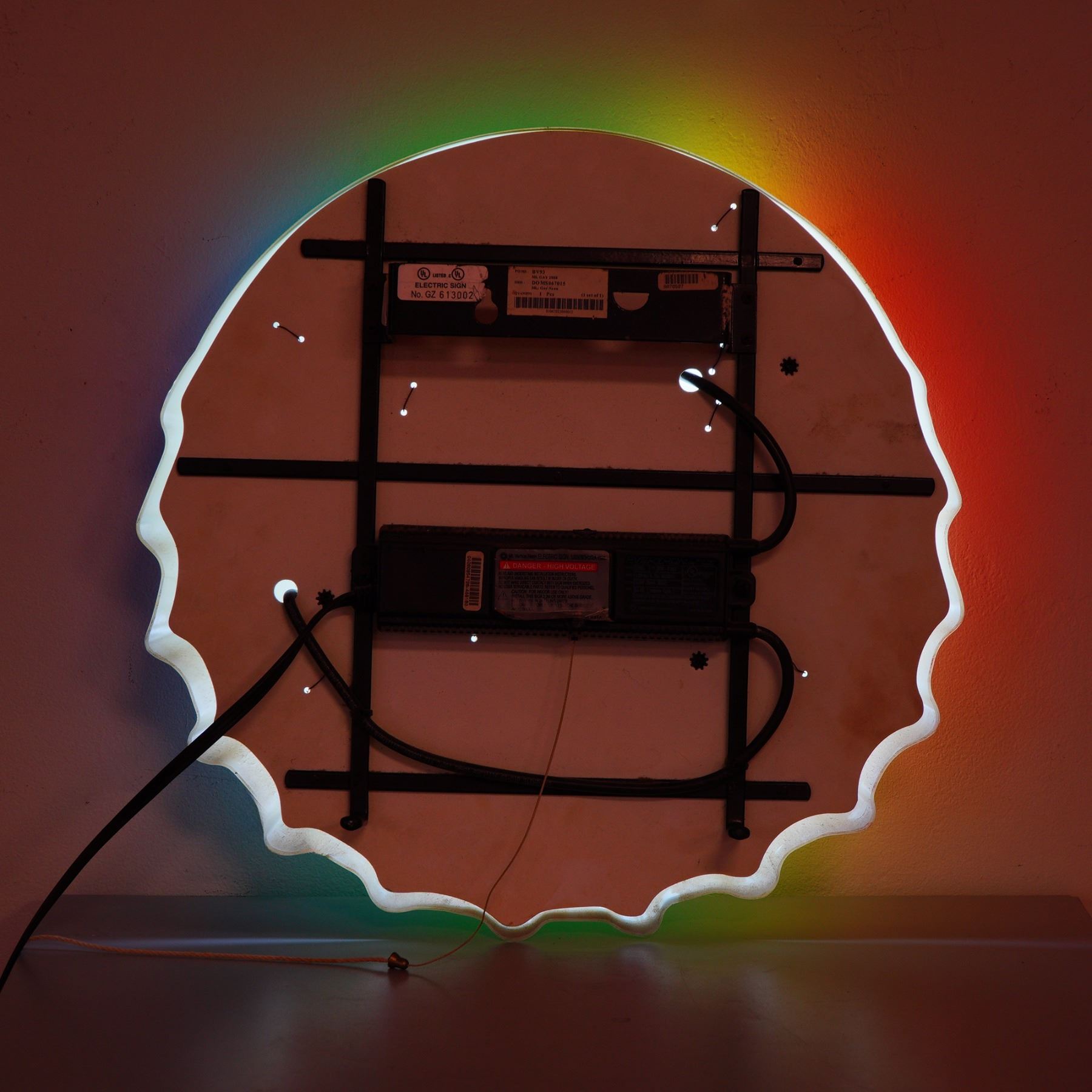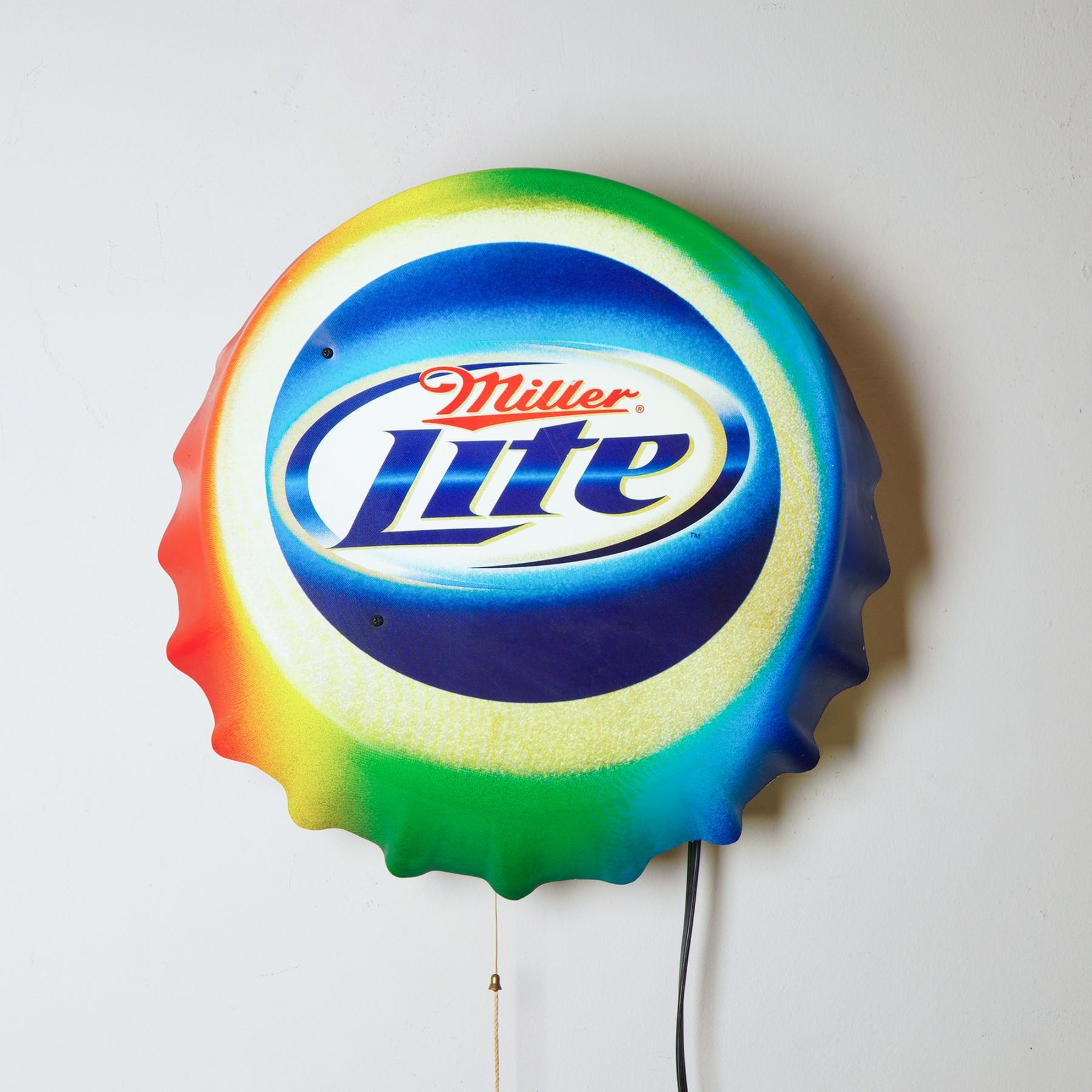 A bold and vibrant Miller Lite advertising sign in the shape of a bottle cap, illuminated with a stunning rainbow gradient that radiates around the classic logo. This electric bar sign is designed with vivid neon lighting that casts a colorful glow, making it an eye-catching centerpiece for any home bar, man cave, or collection of breweriana. The rainbow design makes this piece especially desirable, as it stands out from more common single-color beer signs. Both sides demonstrate the craftsmanship and durability typical of vintage bar lights. With its playful color palette and nostalgic branding, this Miller Lite sign captures the fun and spirit of American beer culture. The back of the sign reveals the original electrical components, mounting brackets, and pull cord, all intact and functional.