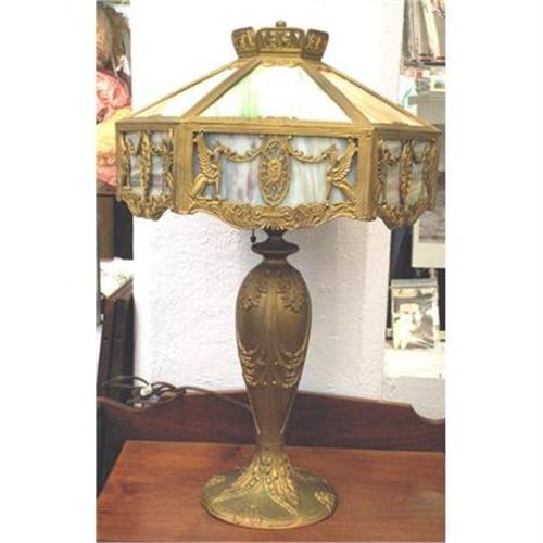 Early 20th century Miller slag glass table lamp stands 29" tall. Base is bronze color with drapery motif. Glass dome shade depicts mythical winged creatures over green and yellow slag glass. Marked "Miller". Excellent condition. Lamp would require professional crating to ensure safe delivery.