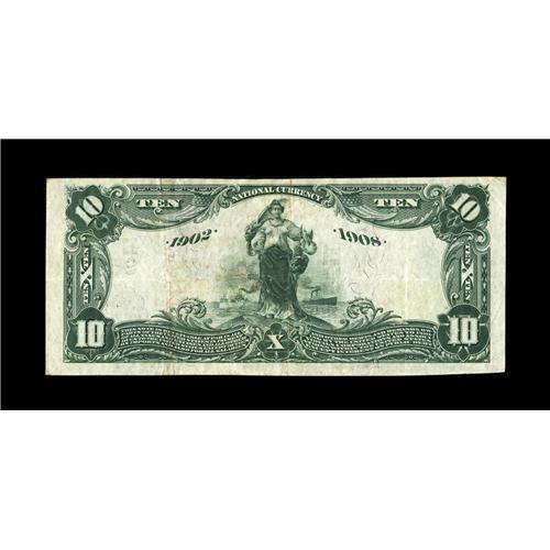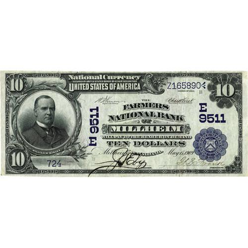 <B>Millheim, PA</B></I> - $10 1902 Date Back Fr. 618 <B>The Farmers NB</B></I> Ch. # (E)9511<BR>A well centered and especially presentable <B>Extremely Fine</B></I> with strong ink signatures and bright color. The paper is so crispy and fresh that this high end circulated note could just as easily have been printed yesterday. This bank issued large size under two titles. This was the first. Our offering tonight is the very first $10 Date Back to be documented from here. It is a full grade higher than any of the other known large survivors from this bank and will be a source of pride to its new owner, as it combines scarcity as a type and denomination within an otherwise quite elusive issuer along with exceptionally nice condition. The kind of note definitely worth stretching to acquire.