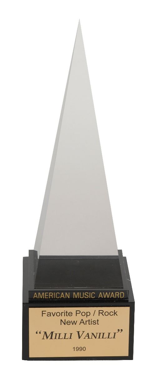Iconic official American Music Award awarded to Milli Vanilli in 1990, measuring 15.25? tall and weighing 6.5 pounds, consisting of an elegant acrylic pyramid with gold text below, “American Music Award,” and an engraved plaque on the front of the black base, “Favorite Pop/Rock New Artist ‘Milli Vanilli,’ 1990.” In fine condition.