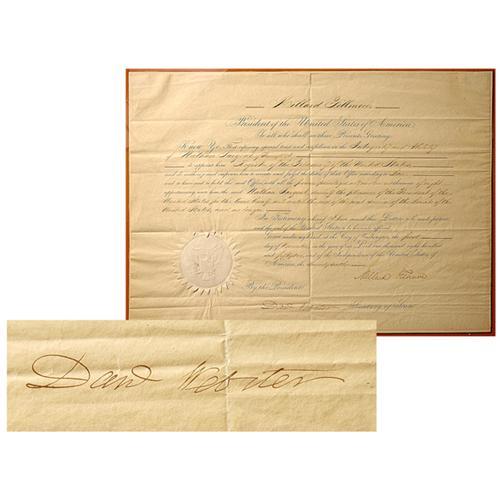 <Our item number 135719><B>Fillmore, Millard.</B> (1800-1874) 13th President of the United States (1850-1853). Document signed as President, 11¾ x 16 in., Washington, 1 Nov. 1851. Countersigned by Daniel Webster as Secretary of State. Appointing Nathan Sargent of Pennsylvania Register of the Treasury of the United States. Fine. Wafer seal is intact at lower left. Attractively matted with portraits of Fillmore and Webster and framed to an overall size of 22¾ x 21¼ in. <BR>Estimated Value $1,000 - 1,500. <BR><BR>Our item number 135719<BR><IMAGES><P ALIGN="CENTER"><IMG SRC="http://www.goldbergcoins.net/liveauction/49jpegs/135719.jpg"> </P></IMAGES>