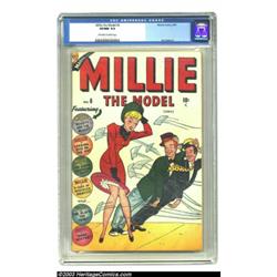 Millie The Model #6 (Marvel, 1947) CGC VF/NM 9.0 Off-white to white pages. Millie was Marvel's tame comic version of "good girl" artwork. This beautiful copy just so happens to be the only copy certified by CGC, to date. Overstreet VF/NM 9.0 value = $224; NM 9.4 value = $280. Important notice: Heritage usually auctions material at the rate of 200-250 lots per hour. On some occasions eBay Live bid software or the Internet may not be able to keep up with the pace of the auction. We recommend placing a realistic absentee bid now as insurance to avoid disappointment. Occasionally the auctioneer may eliminate or reject an eBay Live bid, and the auctioneer may also reopen a lot after the close of the eBay live bidding (usually because we missed an audience bid), and may reject your bid even if it shows you as the winning bidder. By bidding via eBay Live, you agree that Heritage may award the lot to another bidder at its sole discretion under the circumstances described above or any other reasonable circumstances. Also please note that all Heritage lots purchased through eBay Live carry a 20% Buyer's Premium. Please make sure you read the Terms and Conditions before you bid.