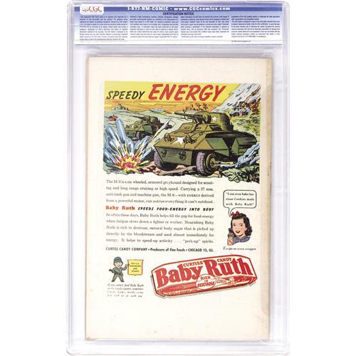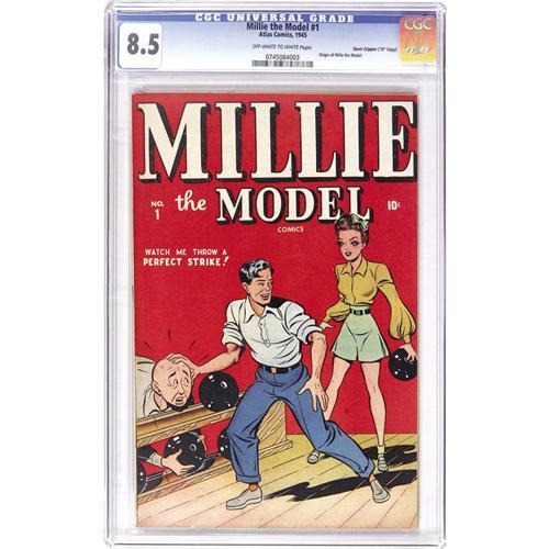 <B>Millie the Model #1 Davis Crippen ("D" Copy) pedigree (Marvel, 1945) CGC VF+ 8.5 Off-white to white pages.</B></I> A great find in this grade, this is a book which usually turns up "hammered," stuck together with tape, or both of the above! We believe this to be Millie's first appearance, and insofar as it's possible for a fashion model to have an origin, that's told in this issue. The character is certainly known to all comic fans, with this title running for almost 30 years, and several companion titles with Millie and her rivals having graced the newsstands too, and of course Millie has popped up in a Marvel Universe book now and then. Most copies of this book have been "read to death," so don't miss one that looks like it wasn't read at all! Overstreet 2006 VF 8.0 value = $544; VF/NM 9.0 value = $860. CGC census 6/06: 1 in 8.5, none higher. <I>From the Crippen Collection.</B></I> <BR><BR><B>Important notice:</B> Heritage usually auctions material at the rate of 200-250 lots per hour. On some occasions eBay Live bid software or the Internet may not be able to keep up with the pace of the auction. We recommend placing a realistic absentee bid now as insurance to avoid disappointment. Occasionally the auctioneer may eliminate or reject an eBay Live bid, and the auctioneer may also reopen a lot after the close of the eBay live bidding (usually because we missed an audience bid), and may reject your bid even if it shows you as the winning bidder. By bidding via eBay Live, you agree that Heritage may award the lot to another bidder at its sole discretion under the circumstances described above or any other reasonable circumstances. Since eBay bids are not shown to us until we open the lot on the floor, we treat those bids just like floor bids. In most cases the floor responds before the eBay bid is presented to us, due to Internet lag time, so for consistency we have made it a policy that floor bids are always considered first over tie eBay live bids. Also please note that all Heritage lots purchased through eBay Live carry a 22.5% Buyer's Premium. Please make sure you read the Terms and Conditions before you bid. This lot is being auctioned in conjunction with a live floor auction by Heritage Auction Galleries. All final auction and invoice information will be supplied by Heritage Auction Galleries, and all other information should be considered preliminary. Lot:41001 <BR><BR><B>Winning Notification and Billing:</B> After the FINAL session in this auction is complete, Heritage will send e-mail and snail mail invoices. This process normally takes several days. All final auction and invoice information will be supplied by Heritage Auction Galleries, and all other information should be considered preliminary. <BR><BR>This auction will be conducted on a live auction floor and over the Internet through eBay Live. If you choose to place an absentee bid, please take a moment to <font color='#0000ff'><u><a href='http://pages.ebay.com/liveauctions/help/before/laabsentee.html'>learn how eBay Live absentee bidding works</a></u></font><font color='#000000'>