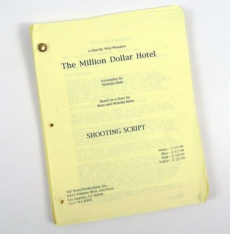 In 2000 Mel Gibson wanted to widen his range as an actor by making "The Million Dollar Hotel" with his own production company, and famous independent German director Wim Wenders. From a story by rock legend Bono, Gibson plays an FBI agent who goes to a flea-bitten skid-row hotel filled with the lowest of the poor and mentally ill to solve a murder. As is Wender's trademark he filled the cast with an eclectic group of actors including Milla Jovinich, Jimmy Smits, Amanda Plummer, Bud Cort, and equally legendary cult actor and rocker, Richard Edson. This is Edson's personal on-set production script that he used through the filming. It comes from his personal collection.