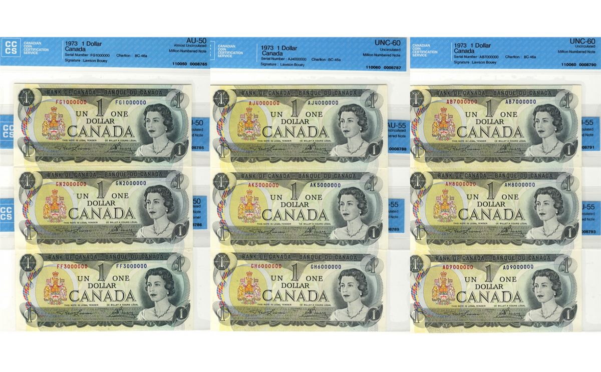 Million Notes 1973 $1 BC-46a #1000000 to #9000000 all CCCS AU50 to MS60. Includes AU50(3), AU55(4) & MS60(2).