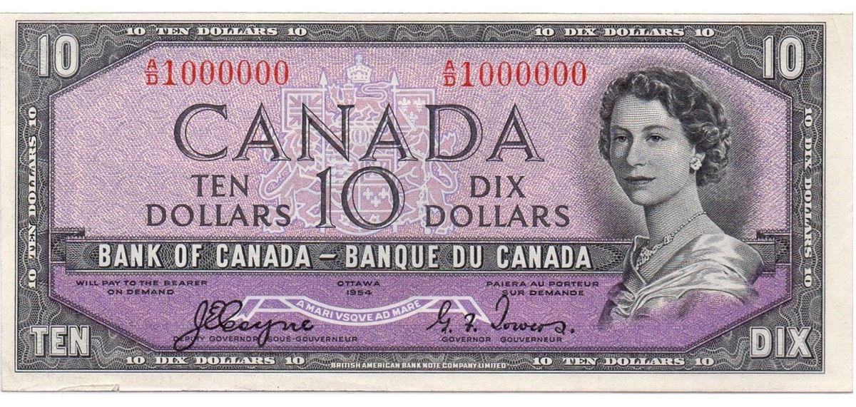 Million issue; 1954 $10 BC-32a #AD1000000, CCCS AU58.