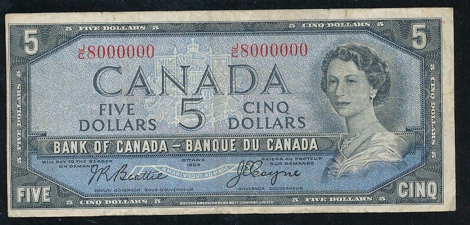 Million issue; 1954 $5 BC-39a #JC8000000. Nice VF issue.