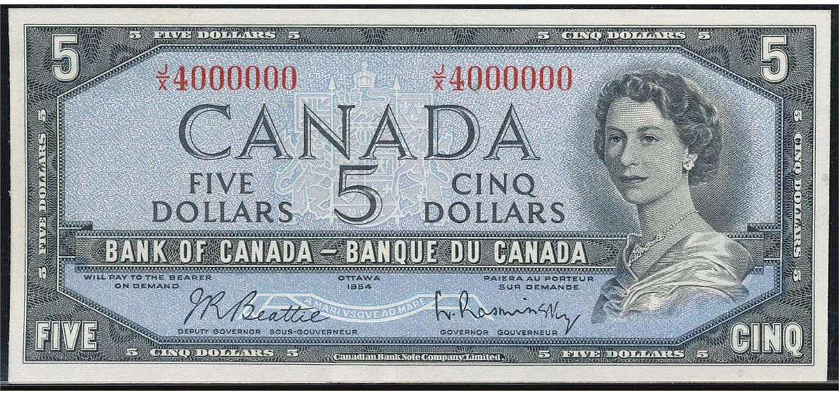 Million issue; 1954 $5 BC-39b #JX4000000. Sharp original AU/UNC.