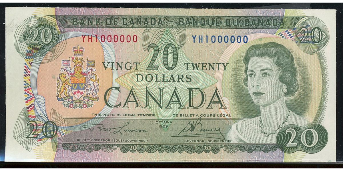 Million issue; 1969 $20 BC-50b #YH1000000. Nice EF issue