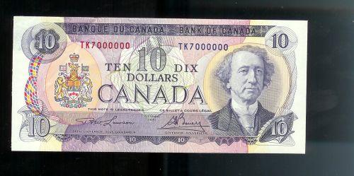 Million numbered note "TK7000000" $10 1971 BC-49c AU.