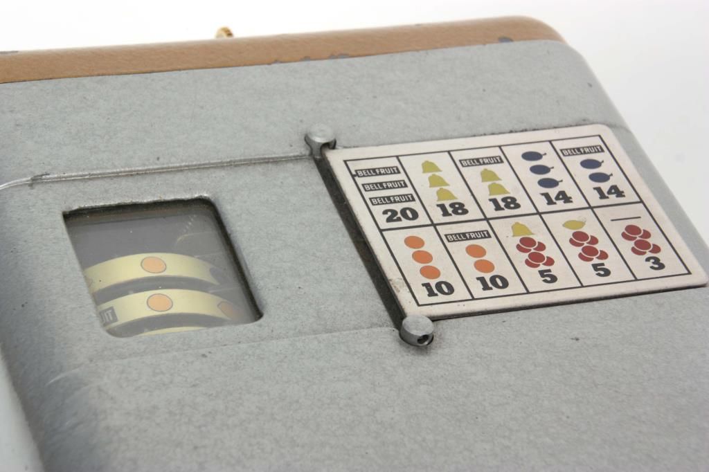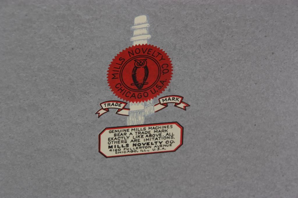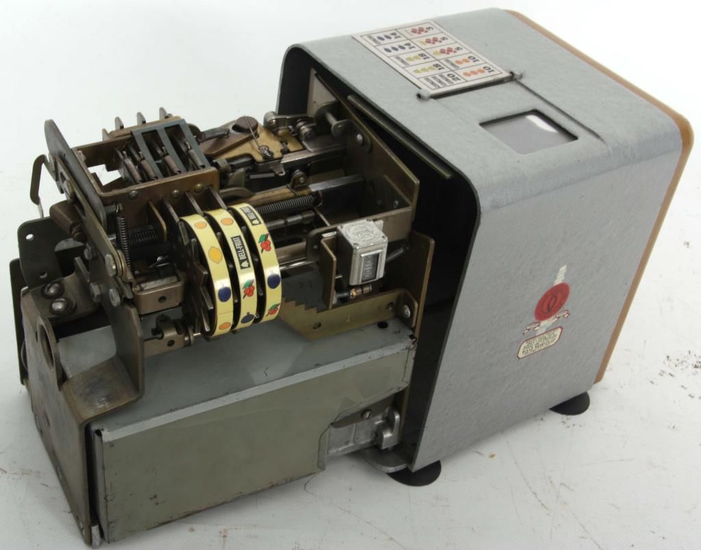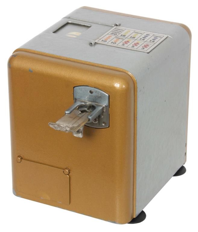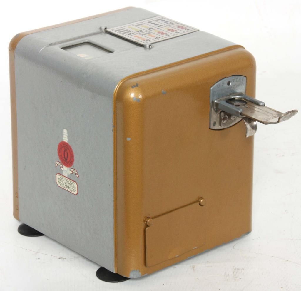 Mills 5 Cent Vest Pocket Slot Machine. Small sized enclosed case has a hinged cover over the mini reels displayed through a glass in the top; the coin slide acts at the lever, spinning the wheels when the lever is pulled back out. Circa 1938-1940. In good working condition, case is repainted with a metallic gold cover and hammer toned silver body. Case has suction cups on the feet and is signed with Mills Novelty Co. decal on the side. 8.25 in. high x 7 in. wide x 11 in. deep.