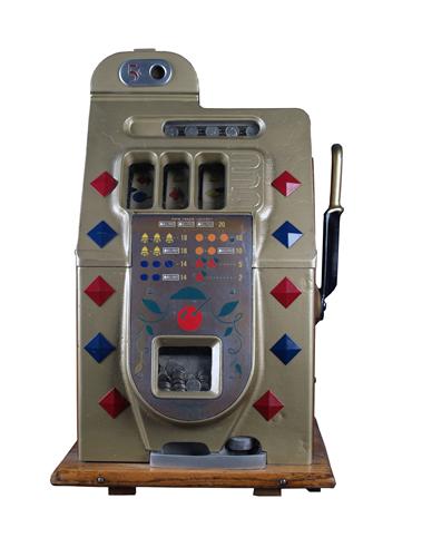 Mills 5 cent Diamond Front Slot Machine Restored, cracked wooden base