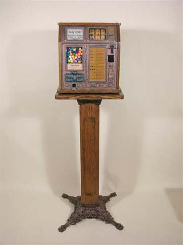 Mills Baby vendor - 3 reel with gum vender/quarter sawn cabinet with matching pedestal/cast iron base/has both keys.