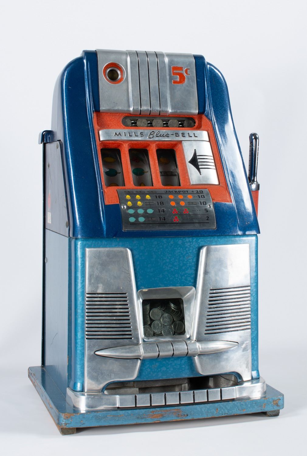 1940s Mills Novelty Company "High Top Blue Bell" 5 Cent Slot Machine. Metal and wooden blue-bodied slot machine, fully restored and plays well. All-original pieces, keys and cash box.