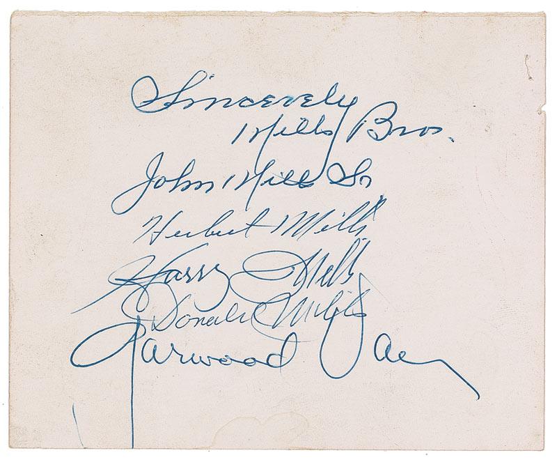 Ink signatures, “Sincerely Mills Bro. John Mills, Sr,” “Herbert Mills,” “Harry Mills,” and “Donald Mills,” plus one other signature on the inside of an off-white 4.5 x 3.5 table reservation card. In fine condition, with some mild soiling and foxing.