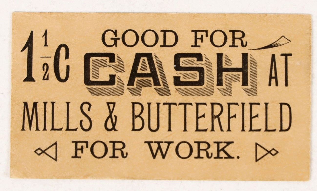 Very rare paper token from Mills & Butterfield for 1- 1/2 cents, a rare denomination, thought to perhaps be before 1858, as the half cent coin was discontinued in 1857.