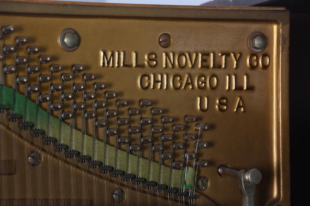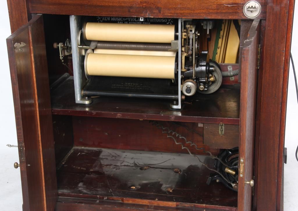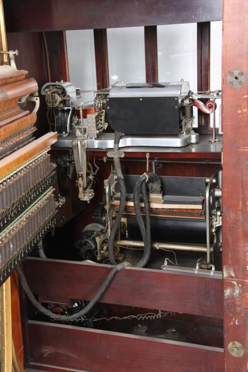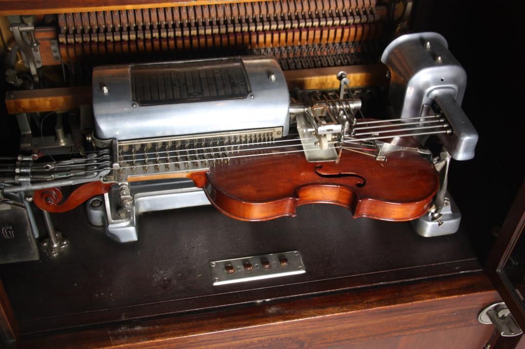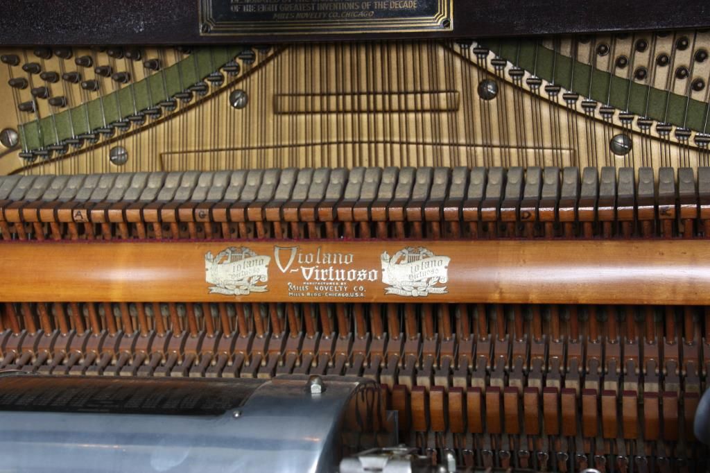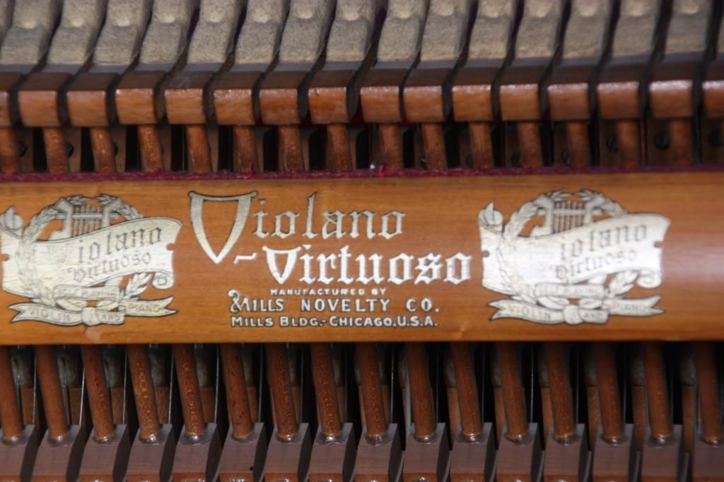 Mills Coin-op Violano-Virtuoso. This rare machine plays from large paper rolls turning on an electric motor contained in the base, simultaneously plays a piano built into the backboard and a single violin in the top section of the cabinet. The violin is in good condition with no breaks or hairlines, has 4 tuning weights, mechanically operated fingerboard and wheel-shaped bows, one designated for each string; violin playing mechanism is contained in a metal case with heavy cast metal chassis having a nickel finish and patent date plaque mounted on the top. The piano is mounted upright on the back board and is signed, and numbered “4070” Mills Novely Co., Chicago, Ill, USA. The large mahogany case has folding front doors with glass panels on the front exposing the violin, doors in the base hide the motor and full length carved pilasters on the sides; 5 cent coin slide is on the front right of the case, stamped number on the back “4179”. Case has an overcoated original finish with some minor losses to the veneer; in good condition and running, has 6 extra rolls. 64 in. high x 43 in. wide x 30 in. deep.