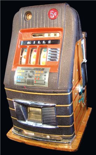 Mills Hi-Top Slot Machine, five cents, restored, black with chrome trim.