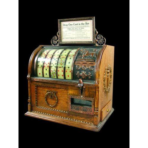 Mills Jockey Coin Operated Slot Machine. Three can play one cent denomination. Oak cabinet with copper flash trim, comes with keys. Very good original working condition. 16 1/2 X 21 X 13 inches.