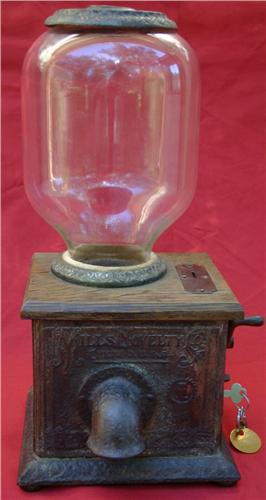 Mills Little Perfection gum vendor is a peanut vendor with a rare metal base and lid made of cast iron and wood. Made by Mills Novelty Co. Patented Sept. 10, 1912. Shows discoloring from age. Appears to be sound mechanically.