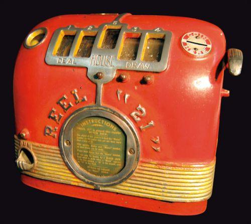 Mills Little Perfection Trade Stimulator, oak case. 4 Reels cards, one cent play, coin operated, cir. 1930. 11 X 15 X 8 1/2 inches.