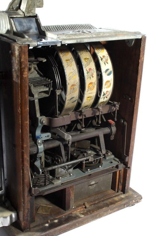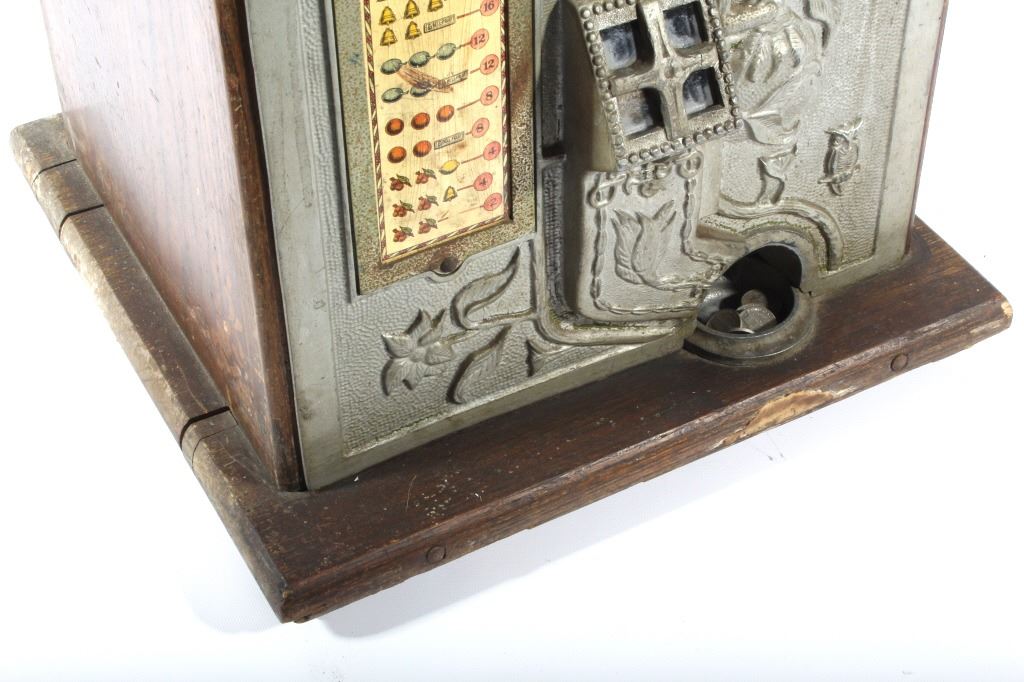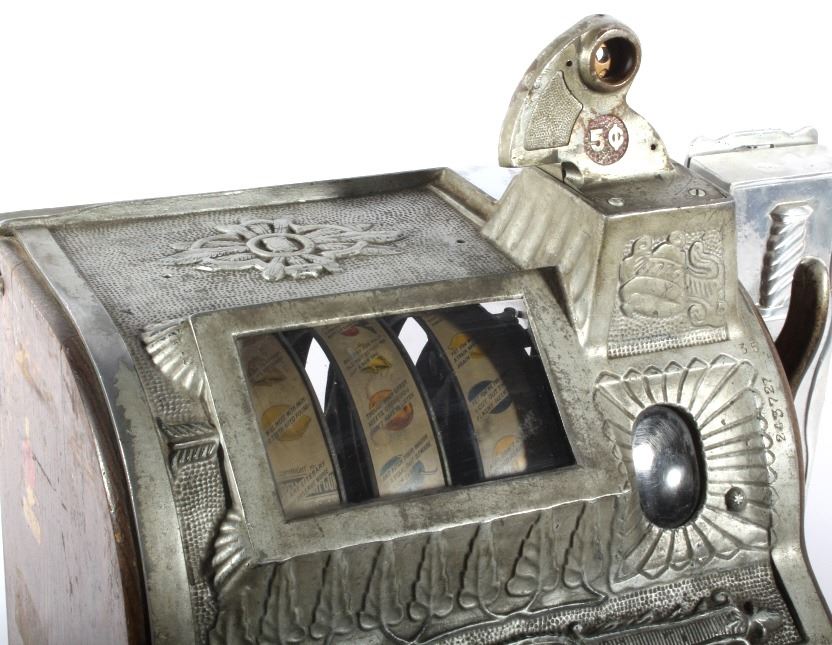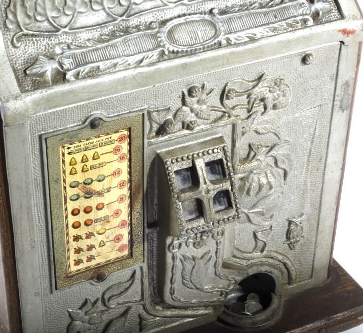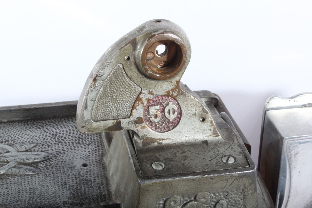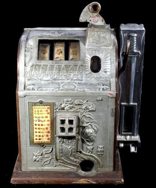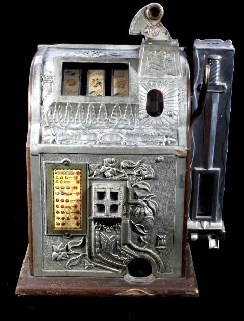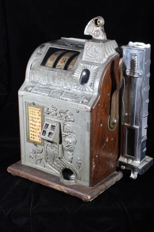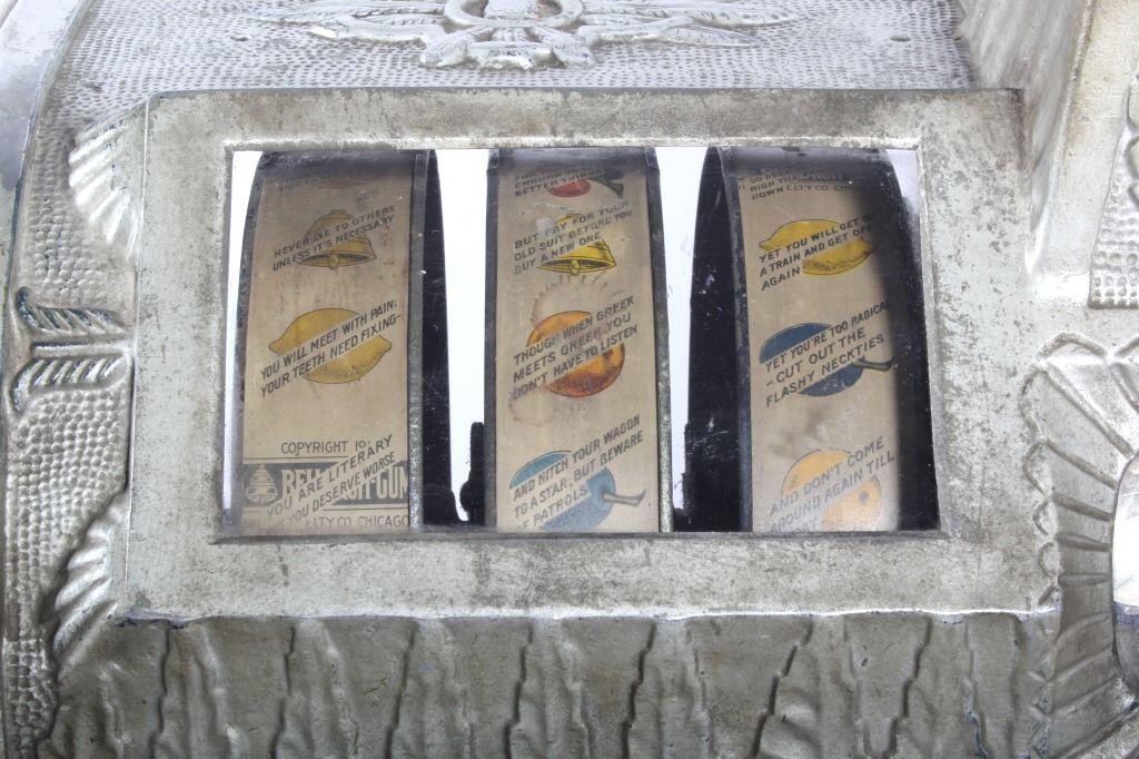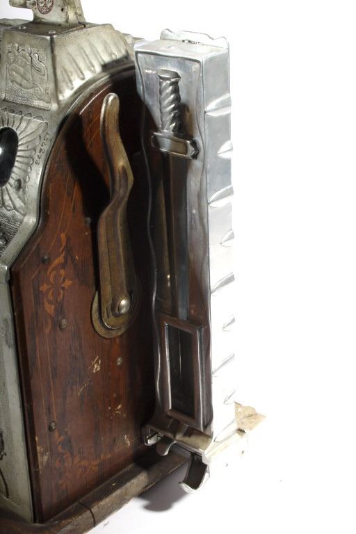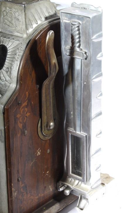 This is an original Mills Poinsettia 5¢ Gooseneck Bell slot machine with an unusual sword side vendor. The rare 1920's slot machine shows a beautifully art deco embossed front with a visible window to view the reels. Each of the reels has whimsical quotes such as "You need fresh air, quit talking to yourself" and "Go to church Sunday, you need the rest". The slot machine is fitted with a unique side vendor which shows an embossed sword with viewing window and dispensing area for mints. The Mills slot machine is in good overall condition. It measures 19.5" wide, 15.25" deep and is 24" tall. Exceedingly rare original with no paint from the factory and the original rare paper reels and key. The side vendor’s age is unknown. This slot machine was previously valued at over $3,500.
