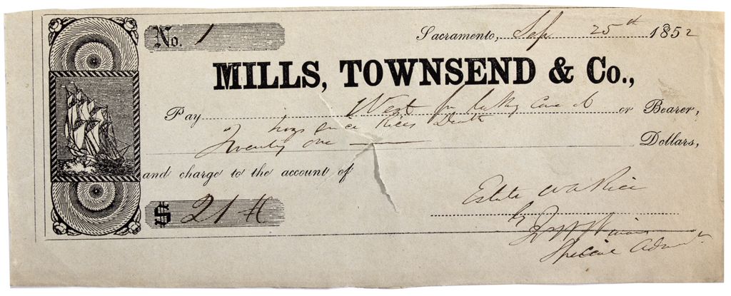 Extra Rare. Pay “West for taking care of hogs since Rice’s Death.” West received $21.00 for his troubles from the Estate of W. A. Rice. The check is signed by J. W. W[illegible] and [illegible] Adams. This is the first check written on the estate account. The vignette on the left of the check is in black ink and is a sailing vessel tacking in rough waves. Darius Ogden Mills and his cousin, E. J. Townsend, opened up this bank in Sacramento. According to Ira B. Cross, in volume one of his book, Financing an Empire: Banking in California, Mills set up an early banking house, named D. O. Mills & Company, Bankers in Sacramento at 55 J. Street between Second and Third Streets in 1849 [Cross, 1927, 78]. Townsend was an early partner but Mills bought him out in 1852 to become the sole owner of the bank. Cross does not explain the change in names from the 1849 bank to the bank listed on this check in 1852, nor if Townsend was with Mills in 1849 or joined him later. Therefore, it is not certain that this check is from Mills first bank in California.City: SacramentoCounty: State: CA
