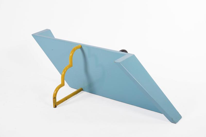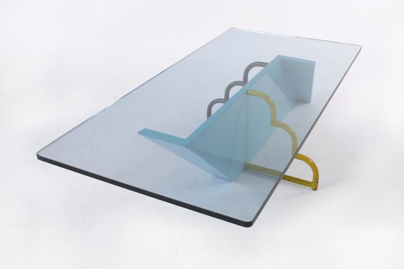 26h x 53w inches base, 32d x 61w inches, blue glas, painted metal base