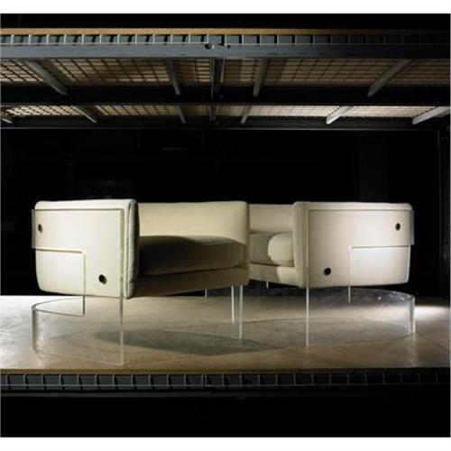 Signed with fabric manufacturer's label to underside of each example: [Thayer Coggin Designed By Milo Baughman].<BR><BR>Condition: Chairs have been professionally reupholstered at one point in time showing subsequent ambient soling consistent with use. Lucite appears in good condition with minor scattered superficial scratches throughout and minute scallop chips to edges along bolts. Overall good vintage condition.