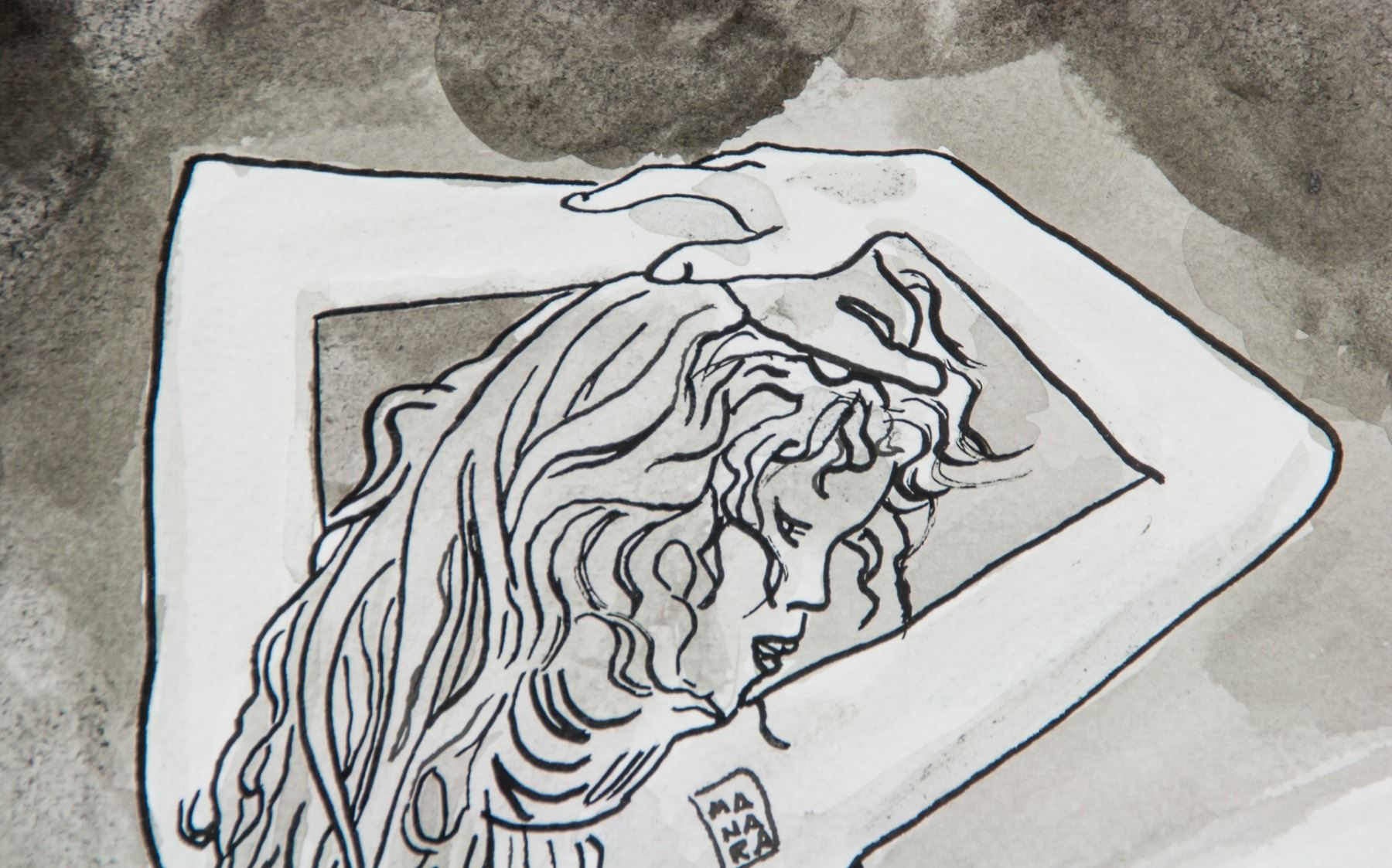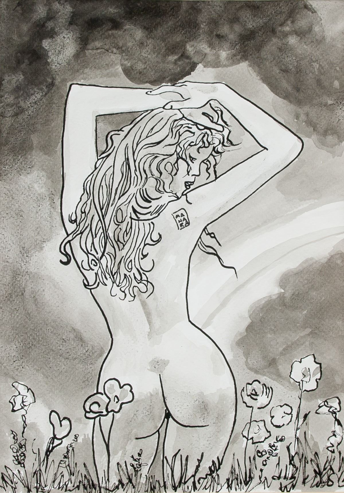 Mixed media on paper, framed. Featuring a nude figure. Signed with monogram over shoulder of figure. Attributed to Milo Manara (born 1945, Italian). 26.5 x 18.5 cm (10.4 x 7.3 inches). Frame size: 42 x 34.5 cm (16.5 x 13.6 inches). PROVENANCE: Southern Ontario estate