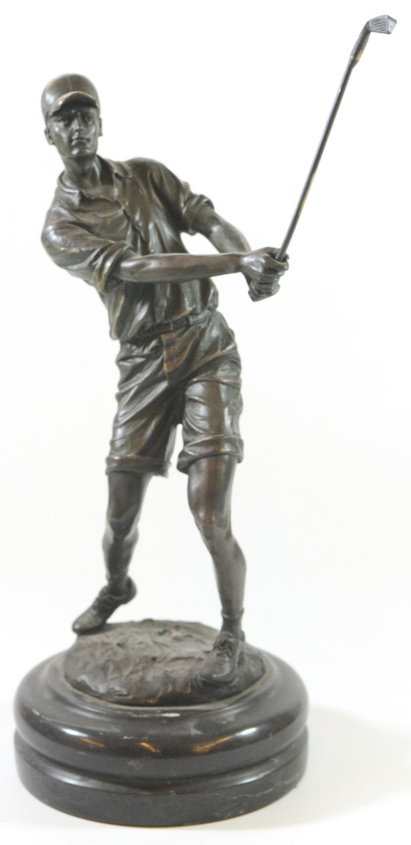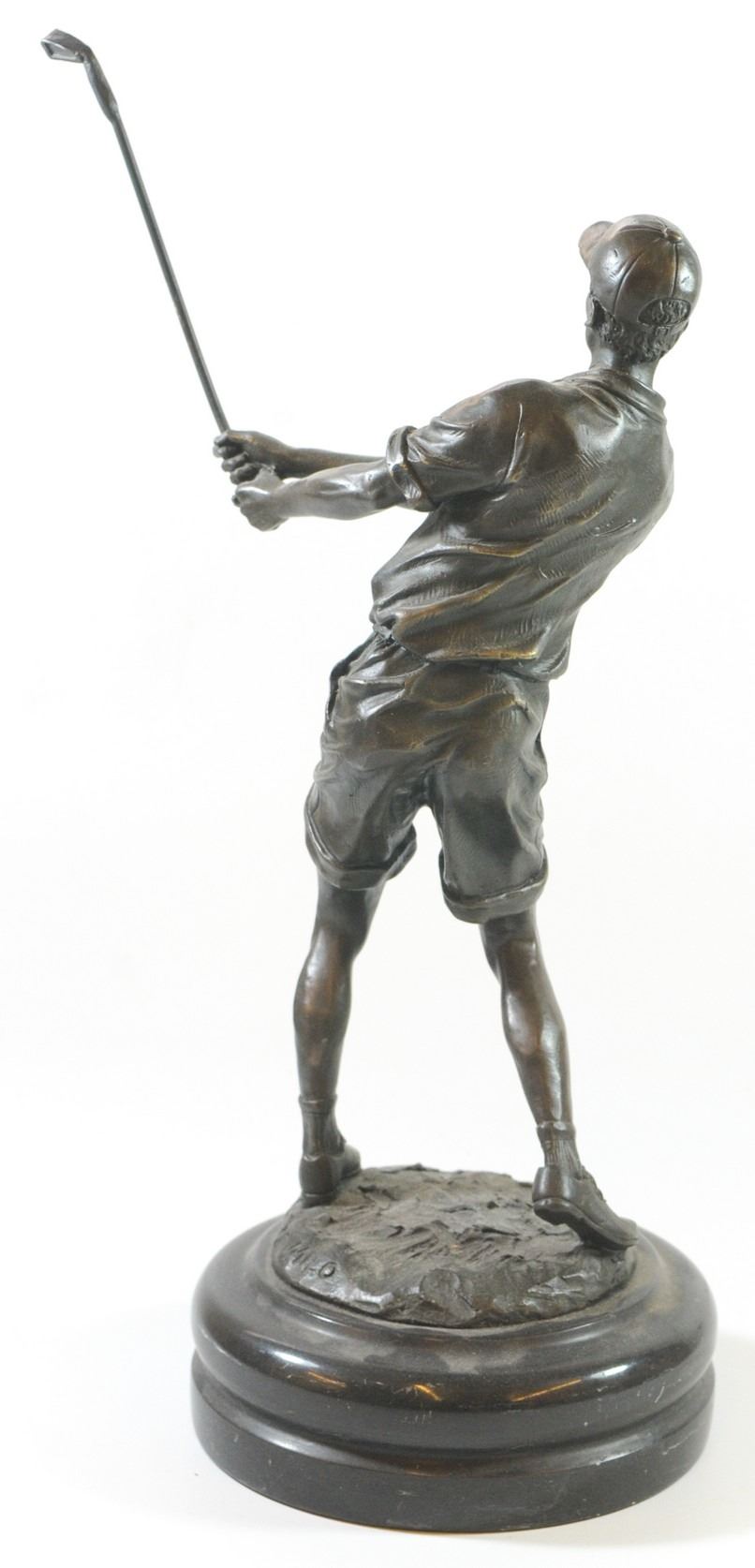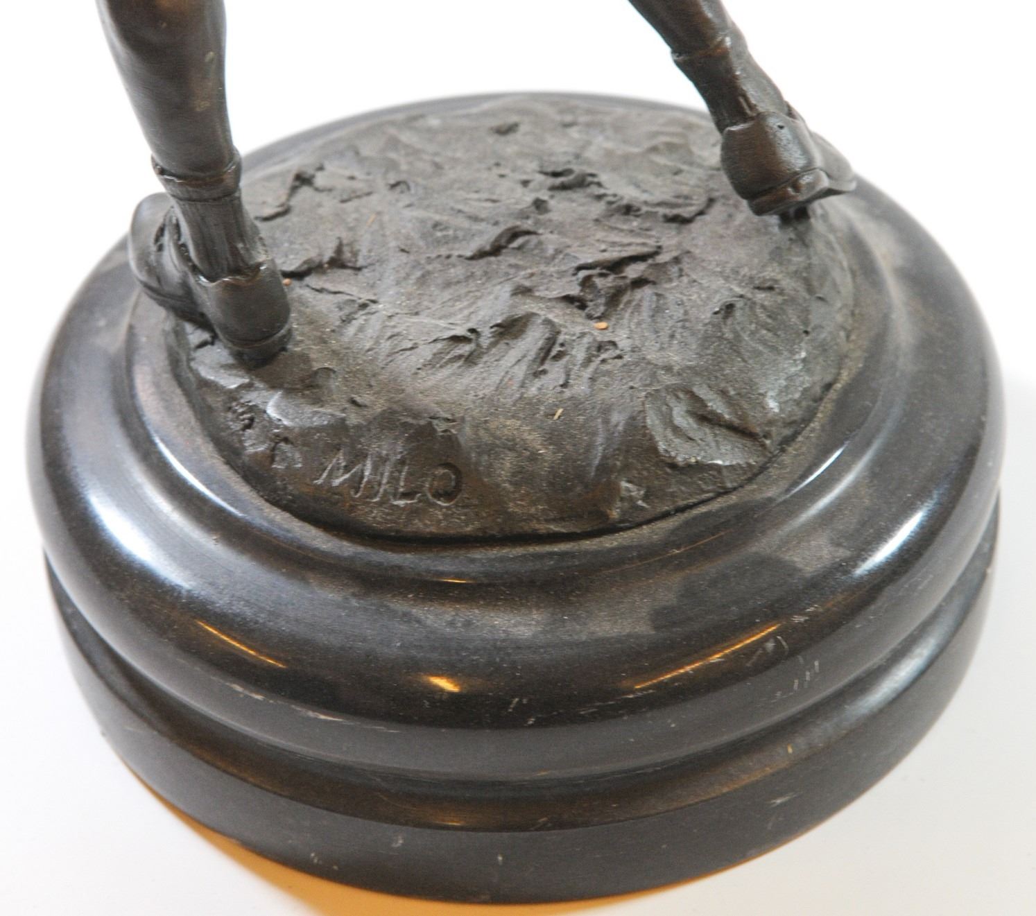 Milo, golf player, bronze sculpture mounted on black marble base, minor scratched and damages at the base, signed, height: 33 cm.