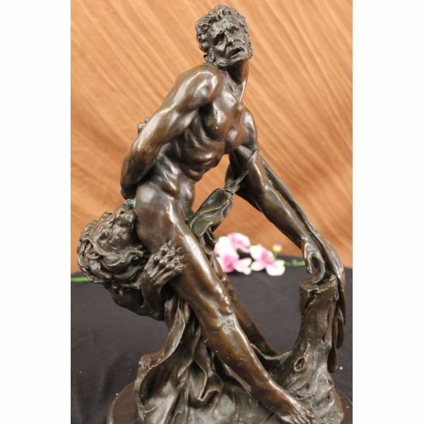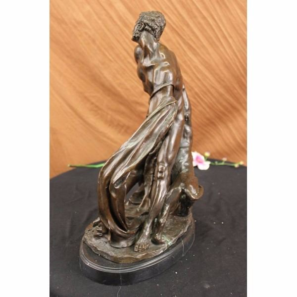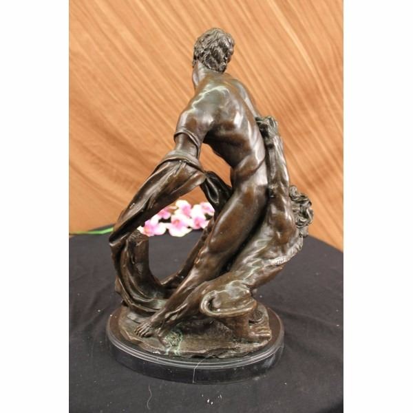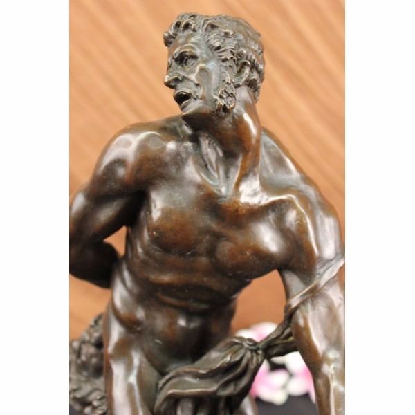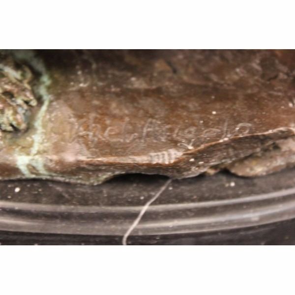 Milo of Croton (Greek: ?; gen.: ?) was a 6th centuryBC wrestler from the Magna Graecian city of Croton in southern Italy who enjoyed a brilliant wrestling career and won many victories in the most important athletic festivals of ancient Greece.[1][2][3] In addition to his athletic victories, Milo is credited by the ancient commentator Diodorus Siculus with leading his fellow citizens to military triumph over neighboring Sybaris in 510BC.Milo was said to be an associate of Pythagoras. One story tells of the wrestler saving the philosopher's life when a roof was about to collapse upon him, and another that Milo may have married the philosopher's daughter Myia. Like other successful athletes of ancient Greece, Milo was the subject of fantastic tales of strength and power, some, perhaps, based upon misinterpretations of his statues. Among other tales, he was said to have carried a bull on his shoulders, and to have burst a band about his brow by simply inflating the veins of his temples.The date of Milo's death is unknown, but he reportedly was attempting to rend a tree asunder when his hands became trapped in the cleft of its trunk, and a pack of wolves surprised and devoured him. Milo has been depicted in works of art by Pierre Puget, tienne-Maurice Falconet, and others. In literature, he has been referenced by Rabelais in Gargantua and Pantagruel and by Shakespeare in Troilus and Cressida.He was fashioned using the ancient method of the lost-wax technique and stained with a brown patina finish for conservation. The sculpture is mounted upon a black marble base with the artist Michelangelo's signature. Condition: This sculpture is in perfect condition. Bronze Dimensions with Marble Base:Height 17" x Width 12" Marble Dimensions: Diameter 10" . Height without base: 16" Weight : 26 LBS Inventory: 85X20517858