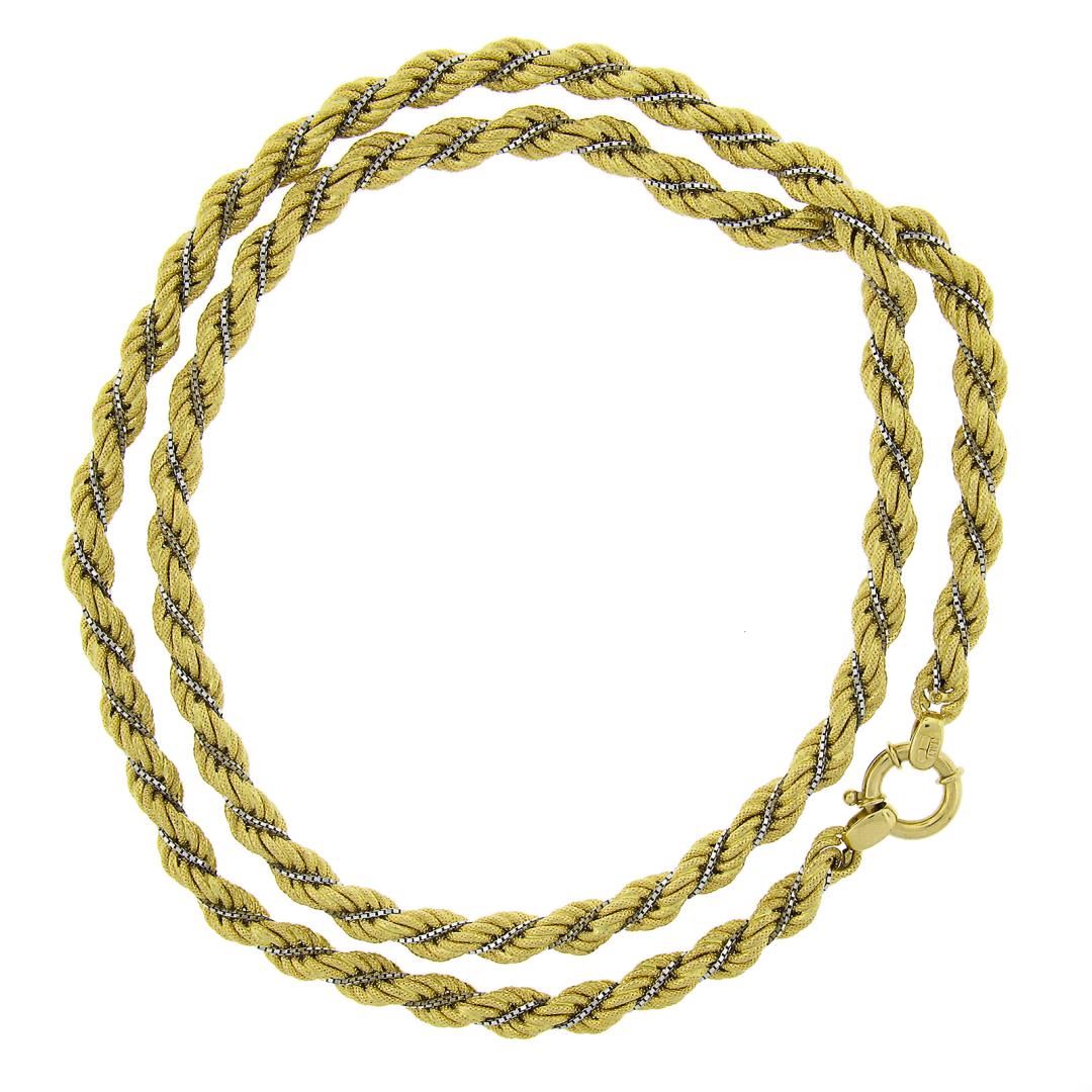 A solid 18k yellow & white gold rope link necklace by Milor. It weighs a total of 73.42 grams, measures 7.8mm wide, and measures 32 inches in length.