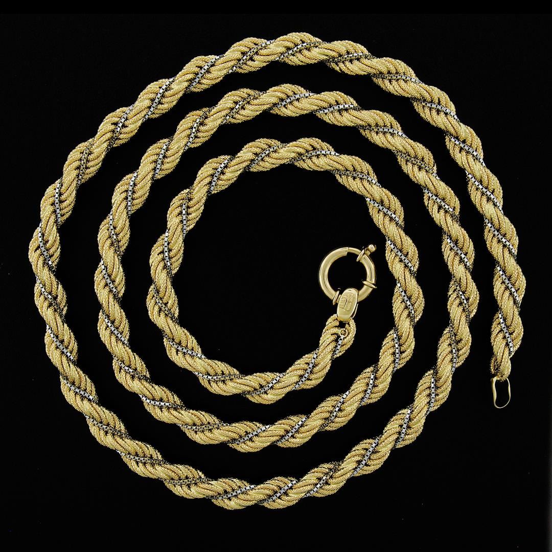 A solid 18k yellow & white gold rope link necklace by Milor. It weighs a total of 73.42 grams, measures 7.8mm wide, and measures 32 inches in length.